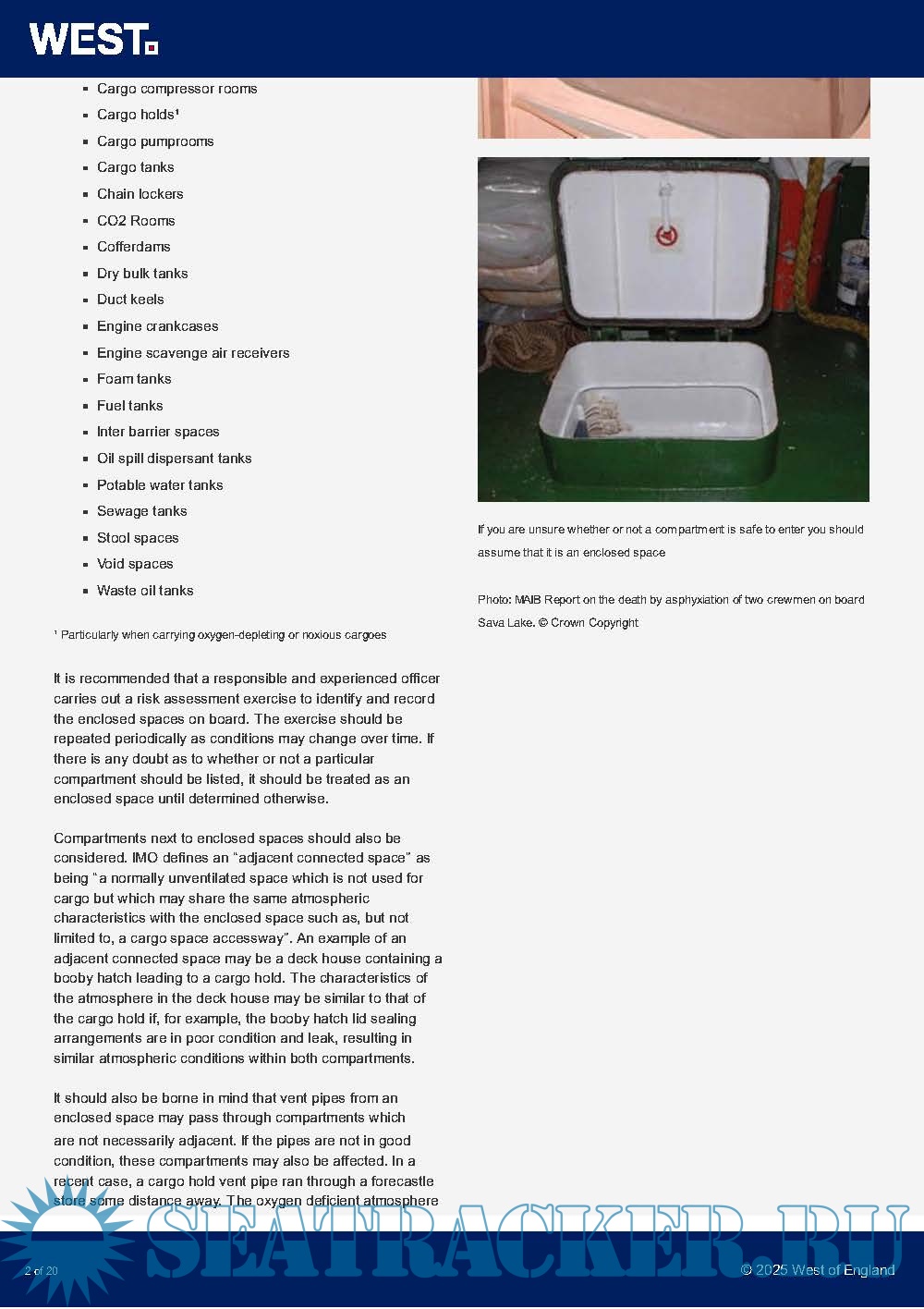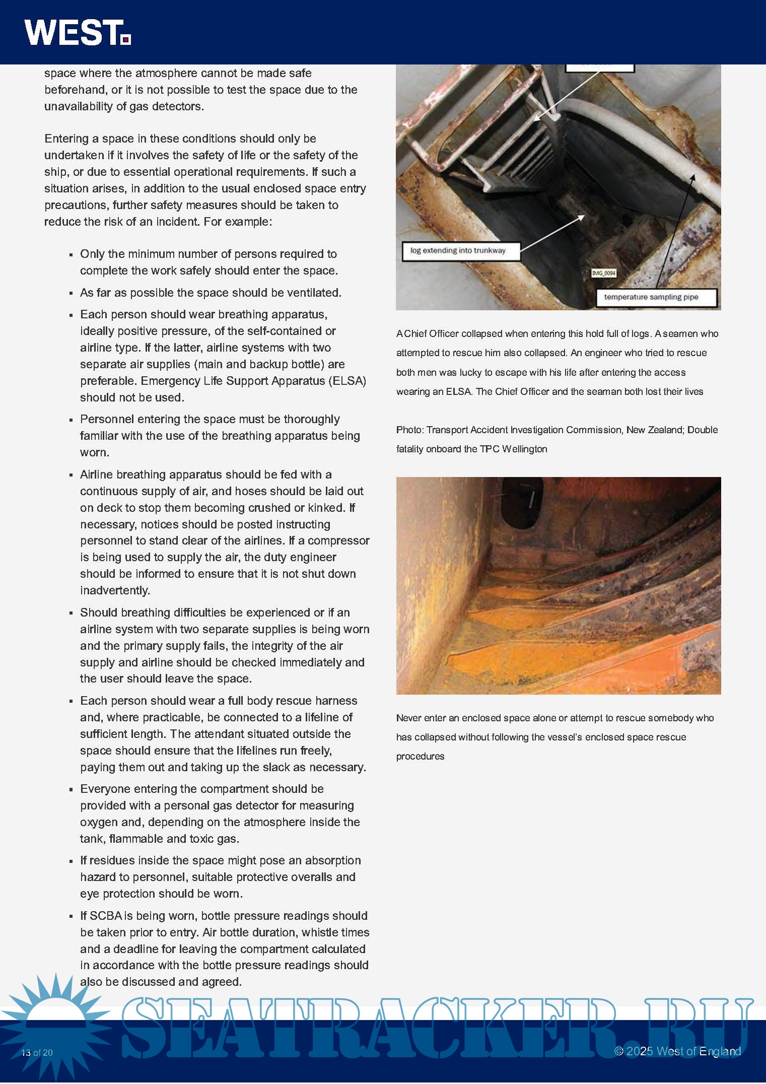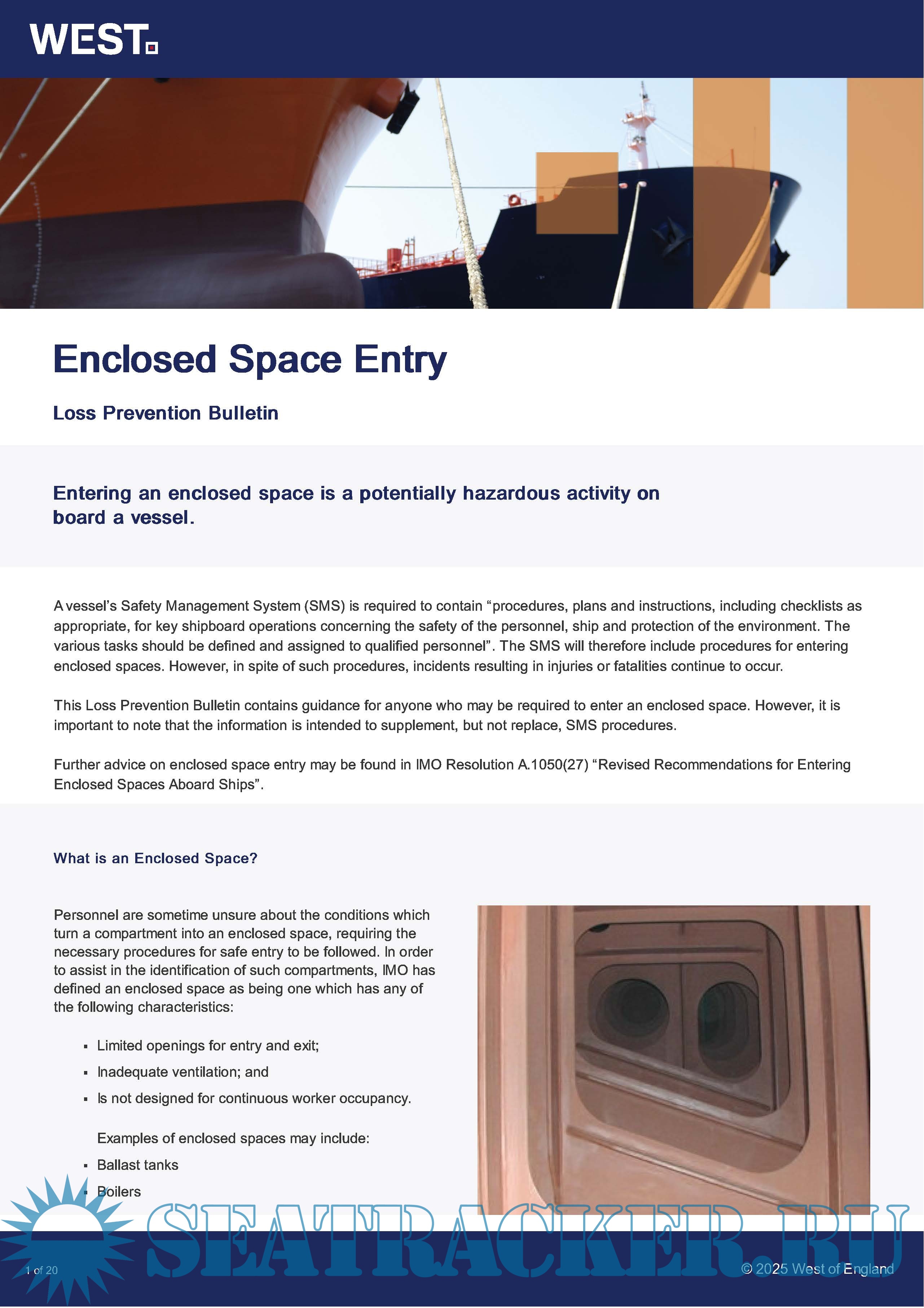 Year: 2025 Language: English Author: West of England Genre: Bulletin Edition: April 2025 Format: PDF Quality: eBook Pages count: 20 Description: A vessel’s Safety Management System (SMS) is required to contain “procedures, plans and instructions, including checklists as appropriate, for key shipboard operations concerning the safety of the personnel, ship and protection of the environment. The various tasks should be defined and assigned to qualified personnel”. The SMS will therefore include procedures for entering enclosed spaces. However, in spite of such procedures, incidents resulting in injuries or fatalities continue to occur. This Loss Prevention Bulletin contains guidance for anyone who may be required to enter an enclosed space. However, it is important to note that the information is intended to supplement, but not replace, SMS procedures. Further advice on enclosed space entry may be found in IMO Resolution A.1050(27) “Revised Recommendations for Entering Enclosed Spaces Aboard Ships”.