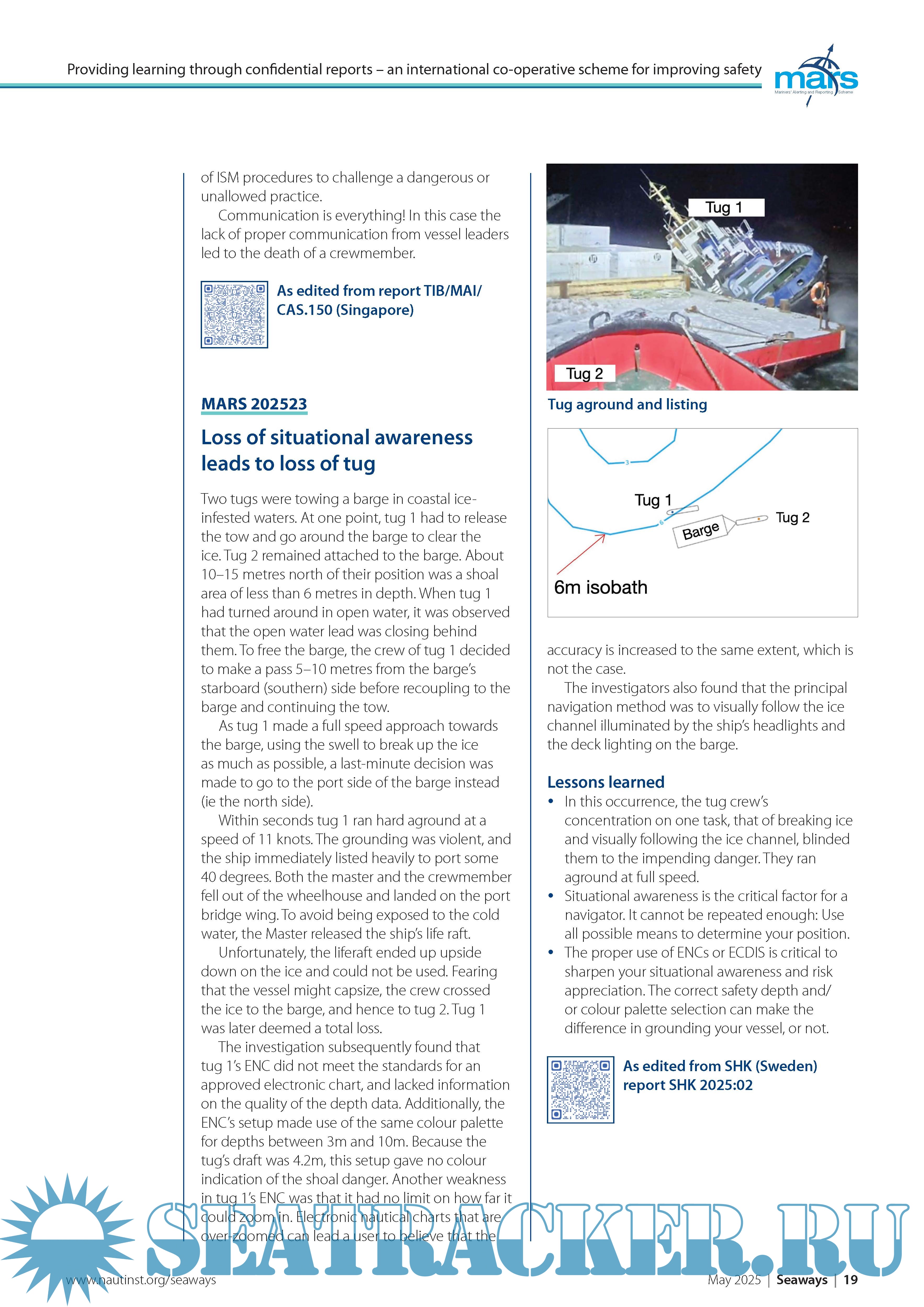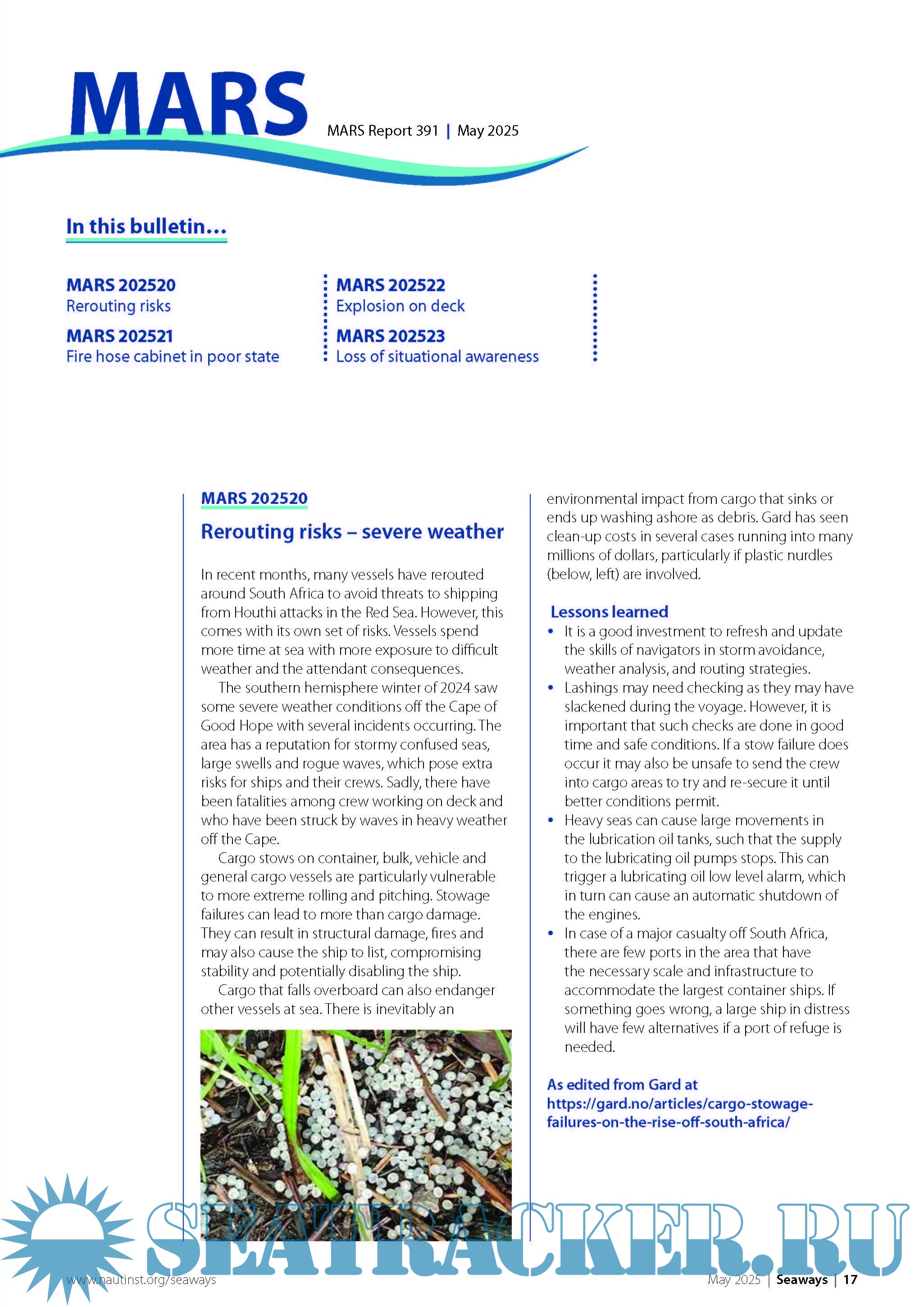 Year: 2025 Language: English Author: The Nautical Institute Genre: Periodical publication Edition: issue 391 May 2025 Format: PDF Quality: eBook Pages count: 4 Description: Providing learning through confidential reports an international co-operative scheme for improving safety. MARS is a searchable database containing reports of accidents and near misses stretching back over a quarter of a century. Funded through the generous support of the Institute's Nautical Affiliate partners, it is one of the maritime industry's leading risk reduction initiatives and is helping to make life safer for seafarers everywhere.