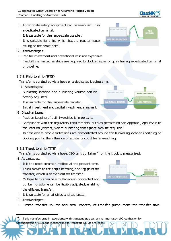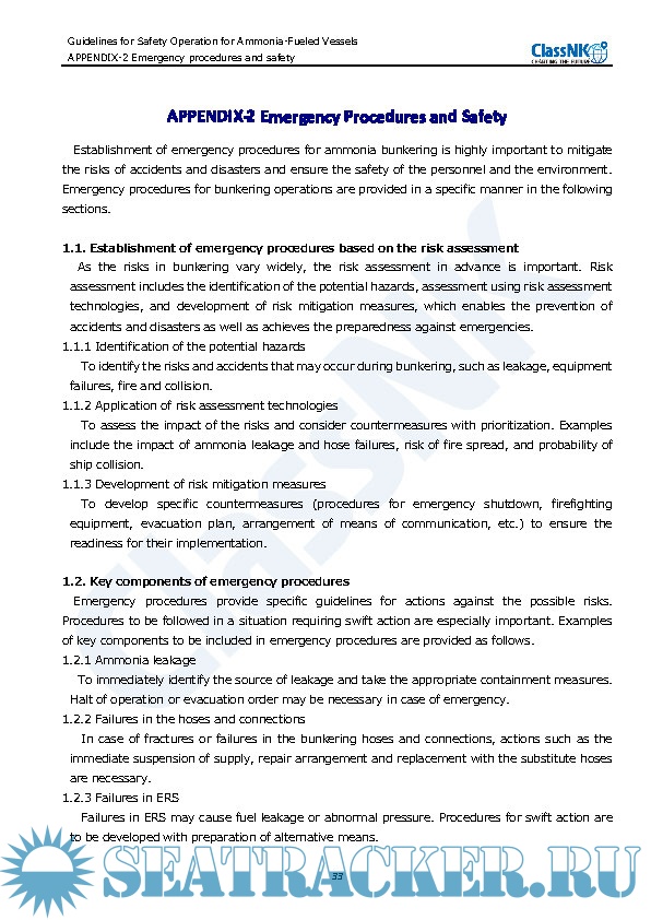 Year: 2025 Language: English Author: ClassNK Genre: Guide Publisher: ClassNK Edition: Version 1.0 May 2025 Format: PDF Quality: eBook Pages count: 46 Description: The objective of this Guidelines is to provide shipowners and ship management companies operating ships using ammonia as fuel with guiding principles to minimize the risks associated with ammonia bunkering and to ensure the safety of personnel engaged in bunkering. The purpose of this Guidelines is to provide shipowners and ship management companies operating ships using ammonia as fuel with guiding principles to minimize the risks associated with ammonia bunkering and to reduce the impact on seafarers, ships and environment. This Guidelines has been developed for ships receiving a supply of ammonia fuels. Ammonia used for bunkering is assumed to be stored in a frozen state of -33 ˚C or below at atmospheric pressure.