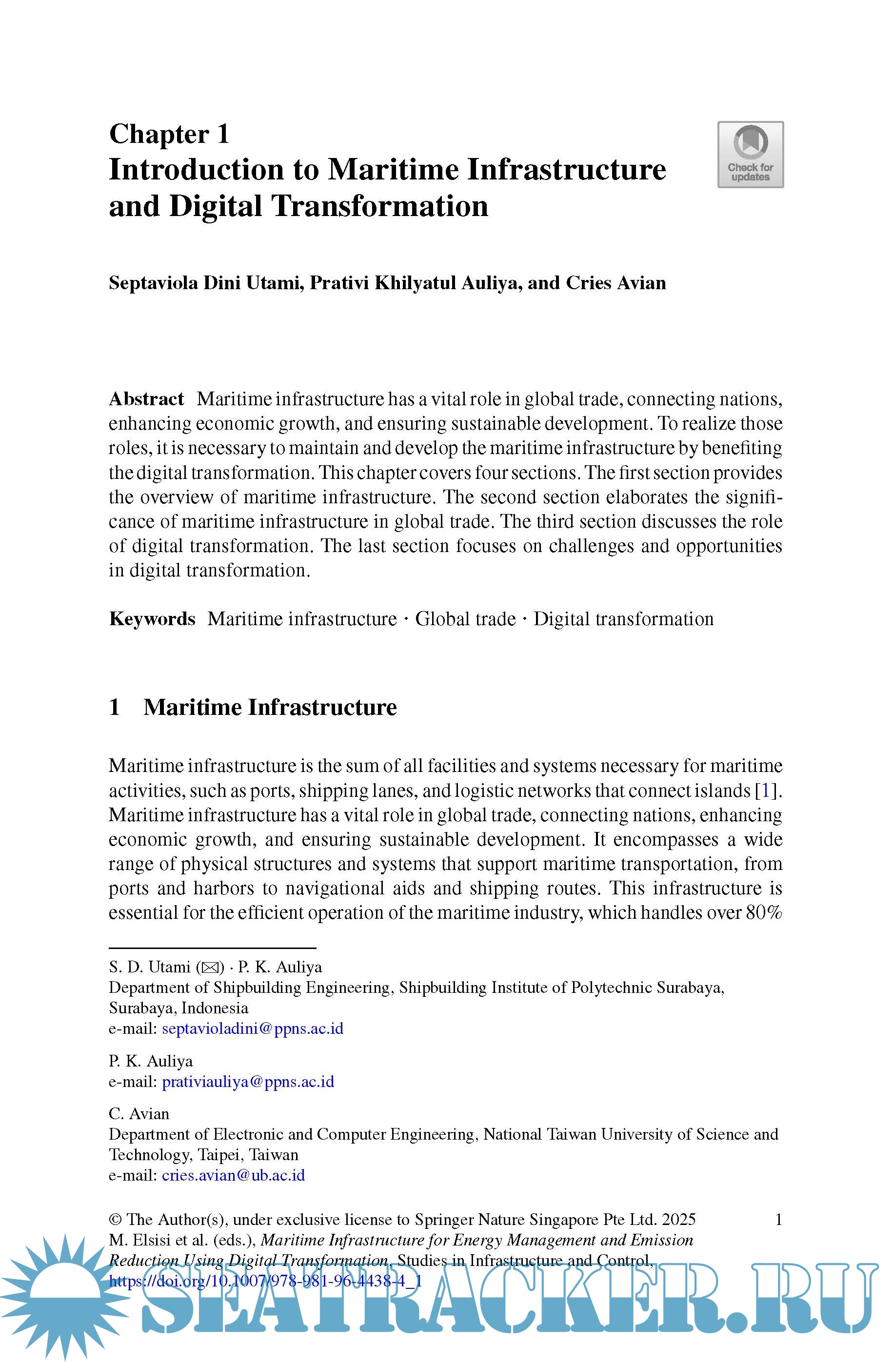 Year: 2025 Language: English Author: Mahmoud Elsisi and Others Genre: Research Papers Publisher: Springer Edition: 1st ISBN: 9789819644384 Format: PDF Quality: eBook Pages count: 303 Description: This book offers a comprehensive exploration of how digital transformation can revolutionize maritime infrastructure for enhanced energy management and emission reduction. As global industries strive to meet stringent environmental regulations and sustainability goals, the maritime sector faces significant challenges in reducing its carbon footprint and optimizing energy consumption. Through a systematic analysis of digital technologies such as IoT, artificial intelligence, and digital twins, this book delves into practical applications that enable real-time monitoring, predictive maintenance, and efficient energy use across maritime operations. Key topics include the integration of renewable energy sources, cybersecurity considerations in digital maritime systems, and case studies highlighting successful implementations of digital strategies. The regulatory framework governing emissions and energy management in maritime operations is also addressed, alongside future trends and innovations shaping the industry’s sustainable evolution. This book is essential reading for maritime professionals, researchers, policymakers, and academics seeking to understand the transformative potential of digital technologies in addressing environmental challenges and driving operational efficiency within maritime infrastructure.