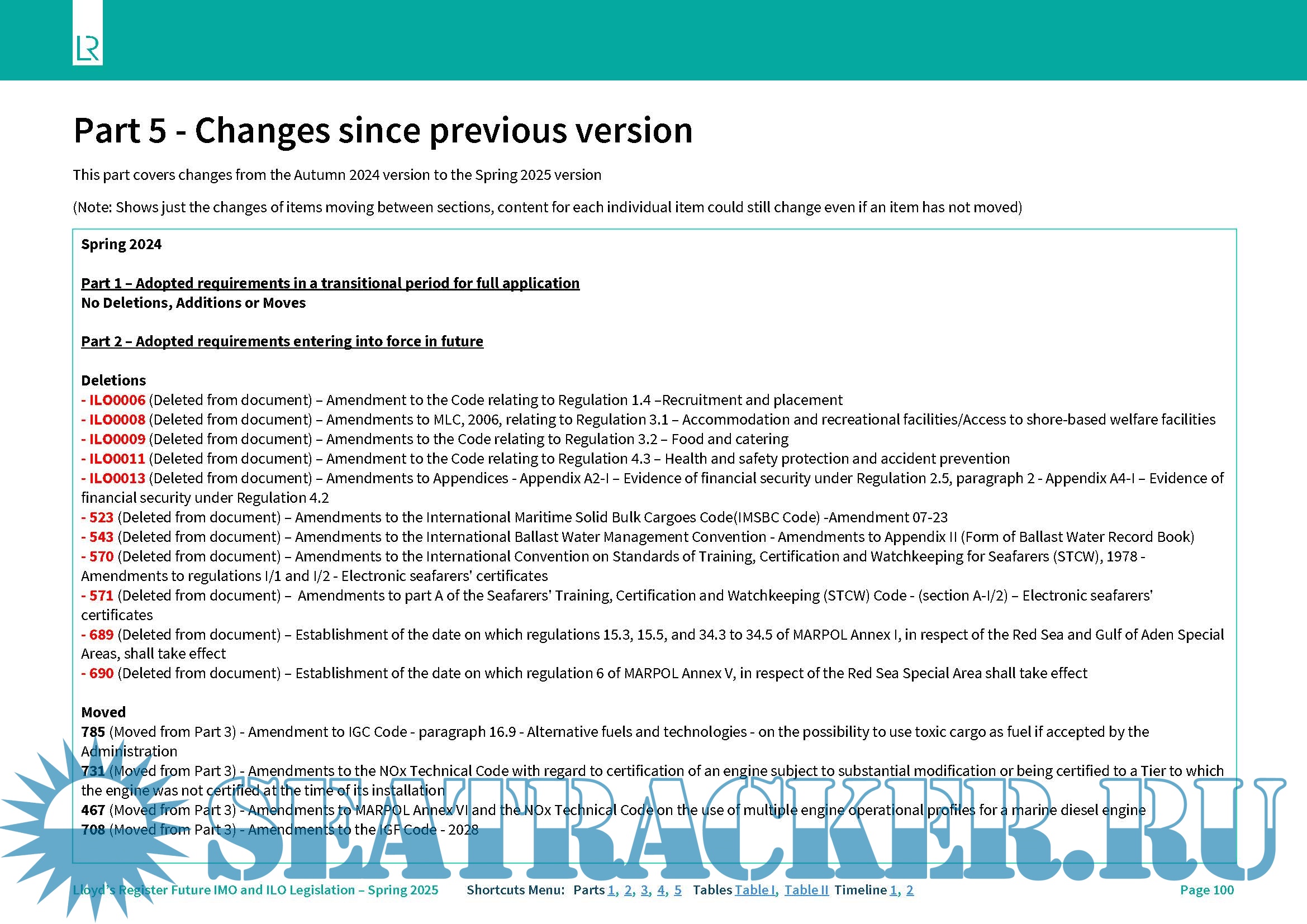 Year: 2025 Language: English Author: Lloyd's Register Genre: Textbook Publisher: Lloyd's Register Edition: Spring 2025 edition Format: PDF Quality: eBook Pages count: 102 Description: Future IMO and ILO Legislation Spring 2025 – Upcoming changes to mandatory statutory regulations and instruments. Including adopted amendments entering into force on or after 1 May 2025, requirements which have entered force but are phasing in for some ships, and significant developments up to and including the Marine Environment Protection Committee (MEPC 83) in April 2025. This version covers updates from the following IMO meetings; MSC 109, SDC 11, PPR 12, HTW 11, SSE 11, FAL 49, MEPC 83 and also from the ILO’s Fifth meeting of the MLC Special Tripartite Committee. The hyperlinked number in brackets is the LR reference used in this document for the detailed entry. :