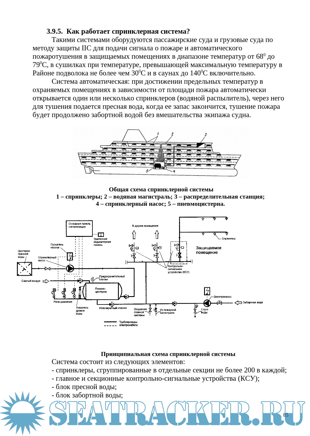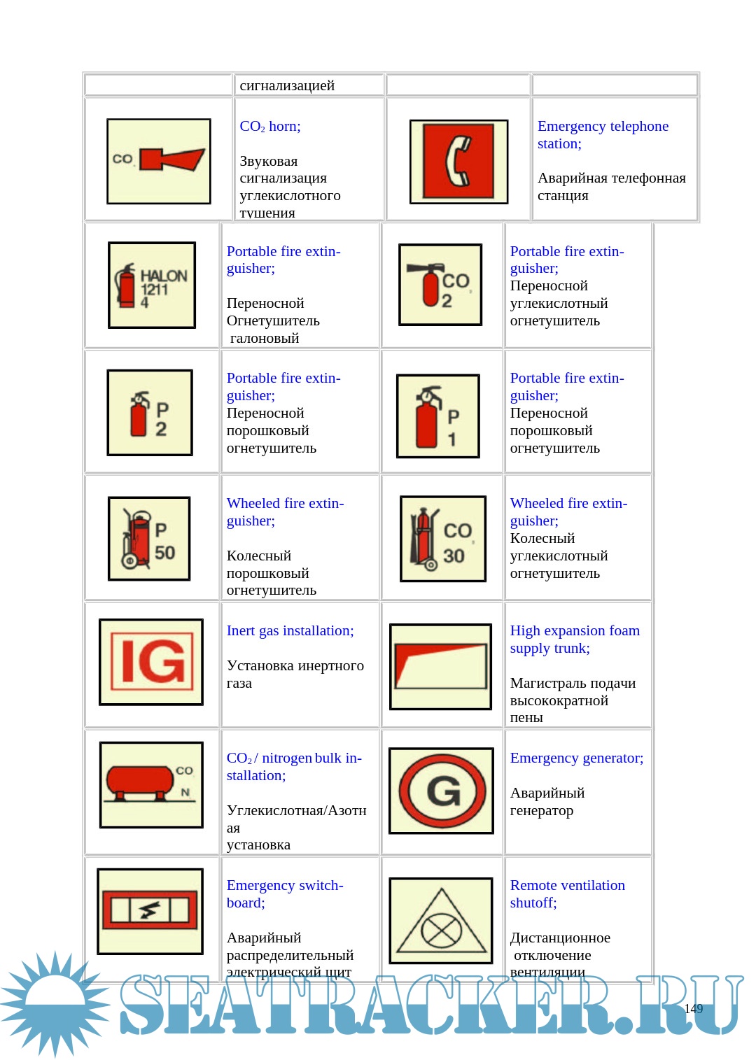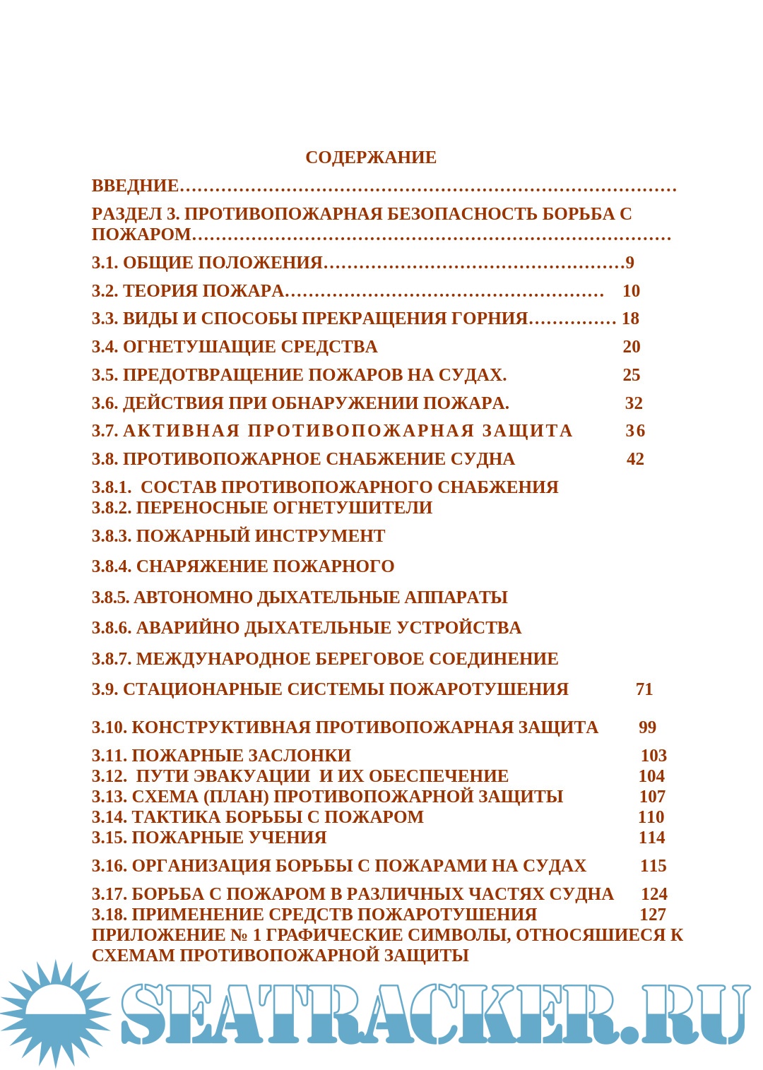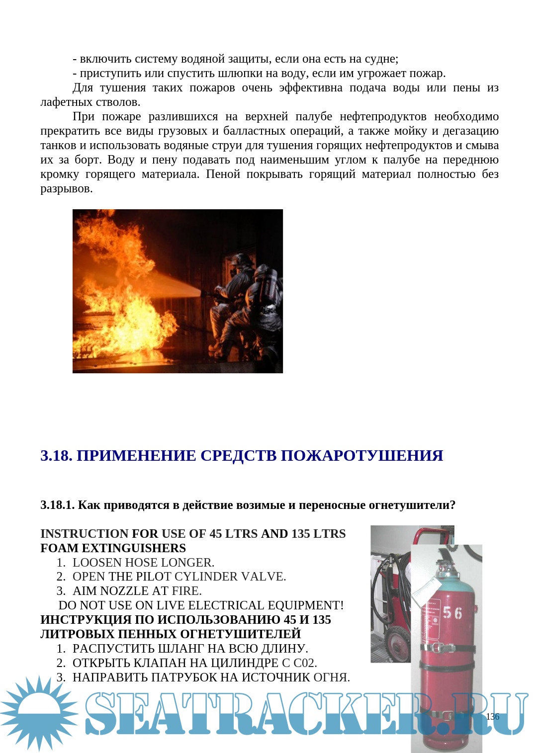 Даны общие указания по методикам тушения пожаров, сведения о значении общесудовых аварийно предупредительных сигналов, об использовании пожарных систем и оборудования, об устройстве и использовании пожарных дверей и заслонок, а также об имеющихся на судне системах и средствах аварийной эвакуации.
