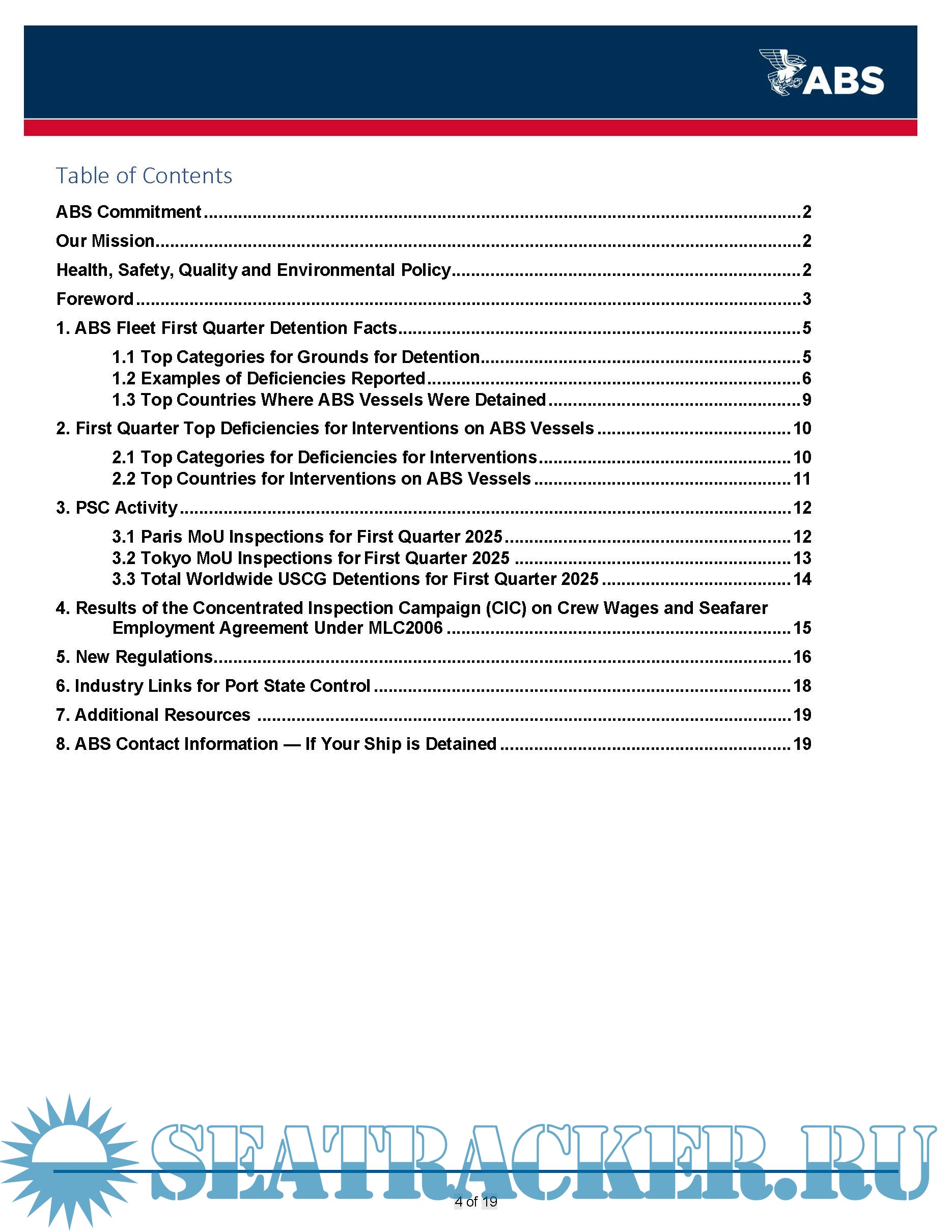 Year: 2025 Language: English Author: ABS Genre: Reference book Publisher: ABS Edition: 1st quarter of 2025 Format: PDF Quality: eBook Pages count: 19 Description: This ABS Quarterly Report on Port State Control (PSC) provides information to owners on deficiencies identified on ABS vessels during inspections carried out by the various PSC regimes globally during the 1st quarter of 2025. This reports are being made available to assist owners by providing awareness of potential areas of concern that have been identified on ABS classed vessels.