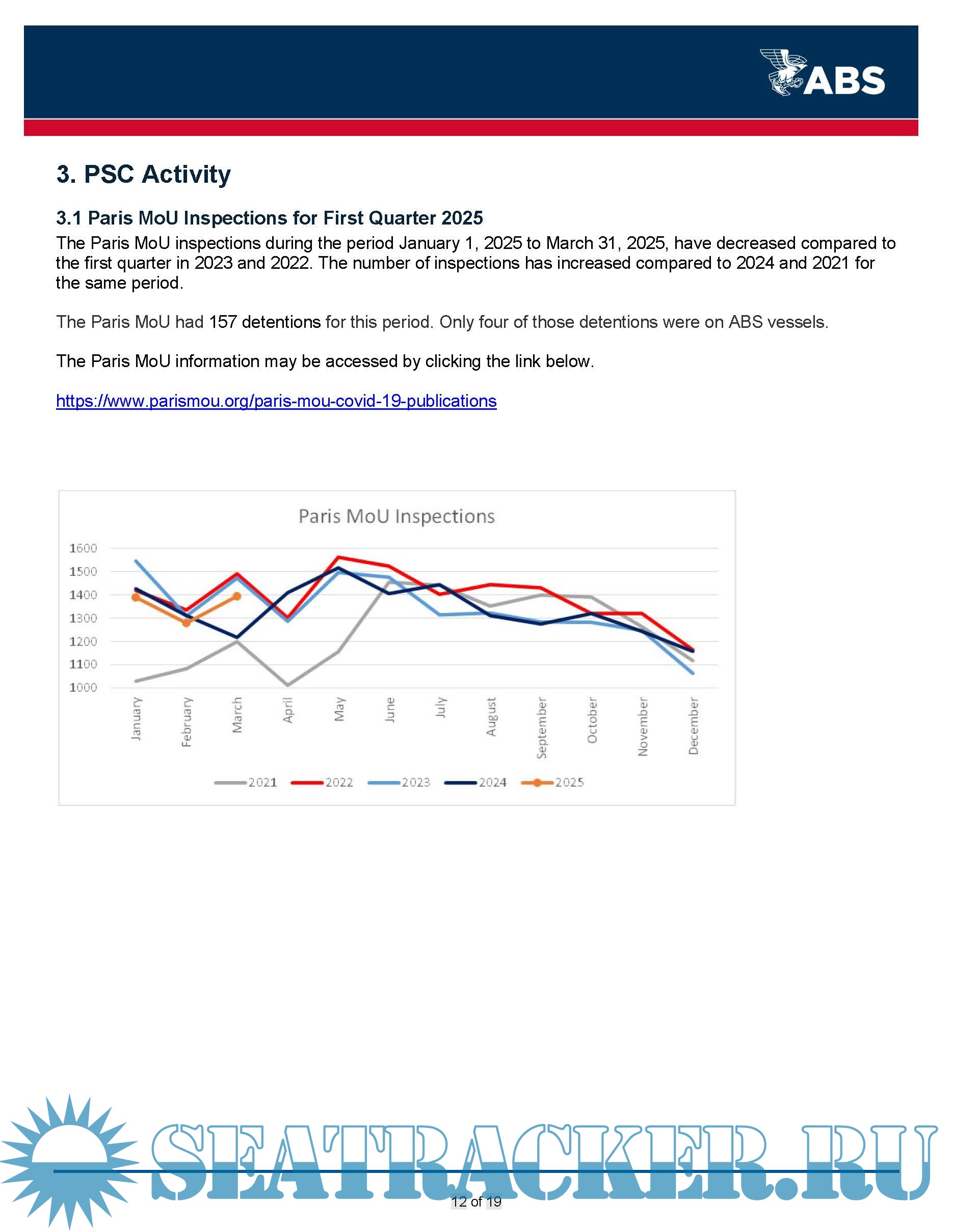 Description: This ABS Quarterly Report on Port State Control (PSC) provides information to owners on deficiencies identified on ABS vessels during inspections carried out by the various PSC regimes globally during the 1st quarter of 2025.