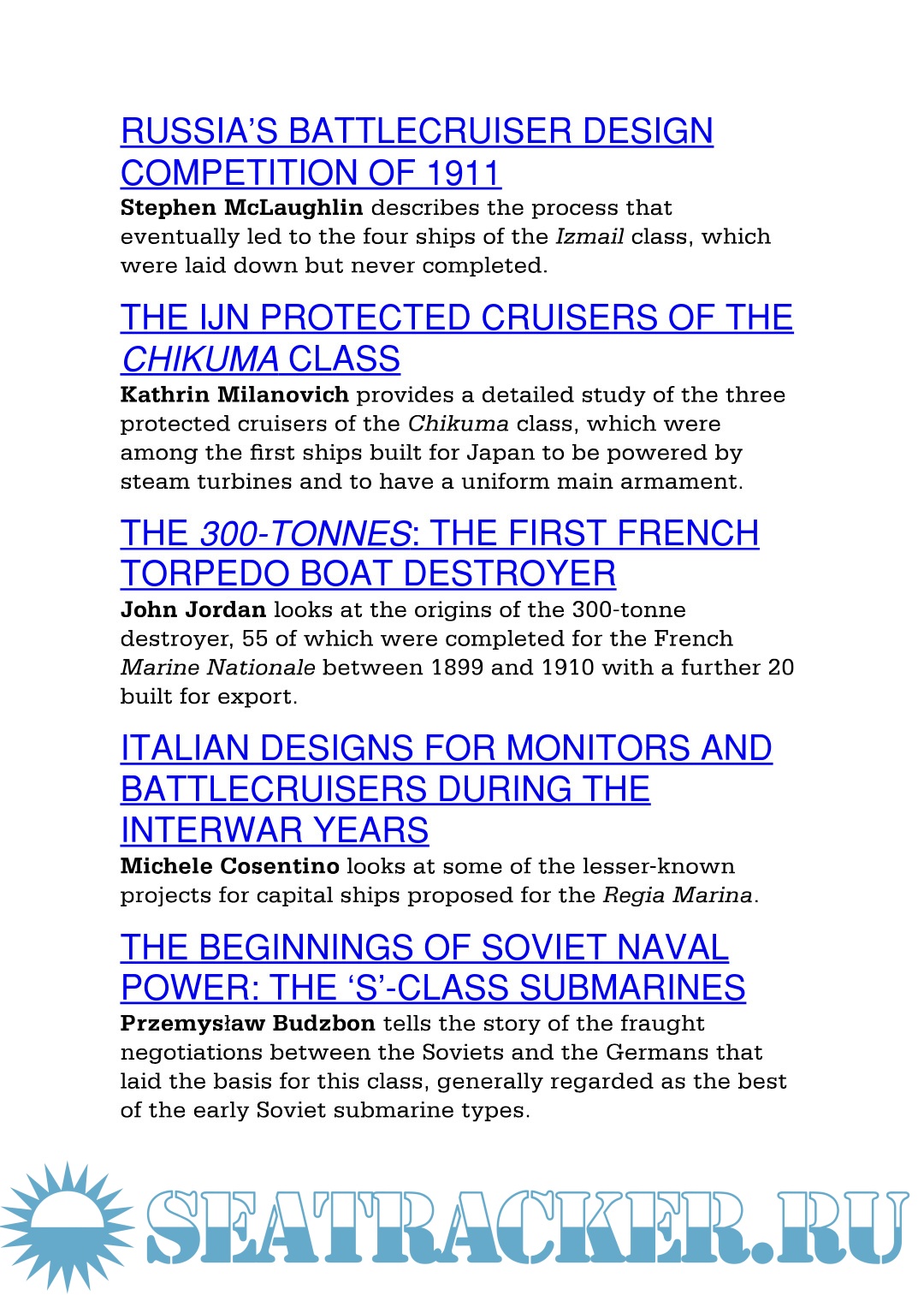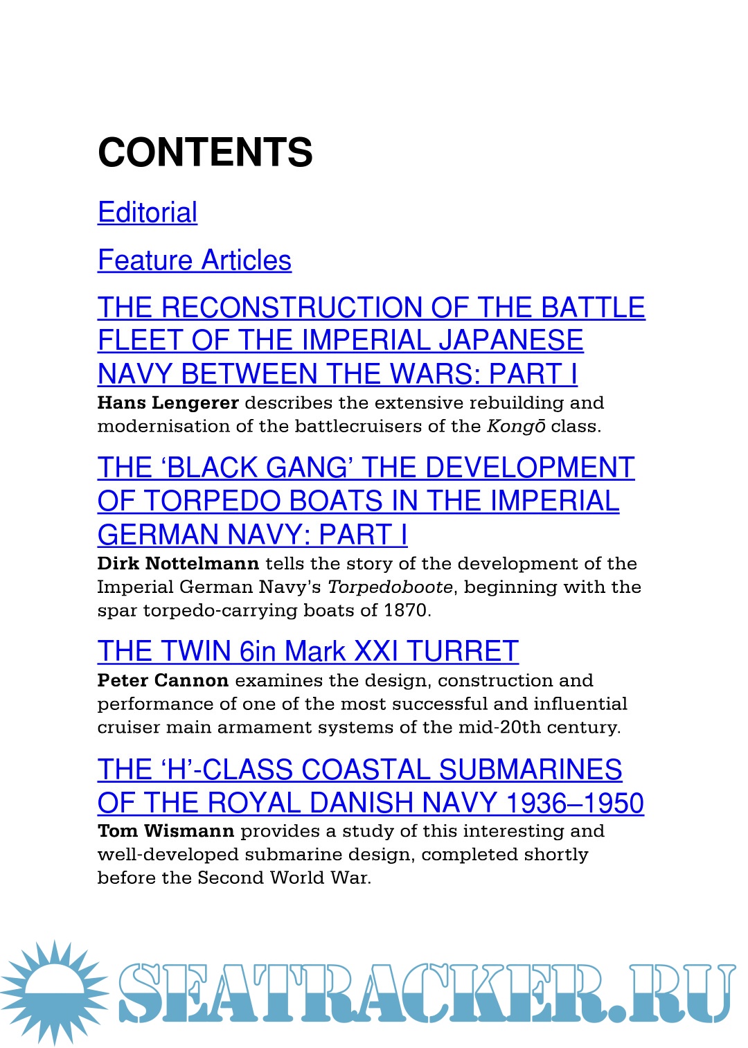 This year's Warship includes features on France's first destroyers, the turn-of-the-century 300-tonne type; Denmark's H-class submarines of World War II; Italy's proposed battlecruiser designs; the Imperial Japanese Navy's Chikuma-class protected cruisers; Soviet S-class submarines; and the first of a series on Imperial Germany's torpedo boats and destroyers.