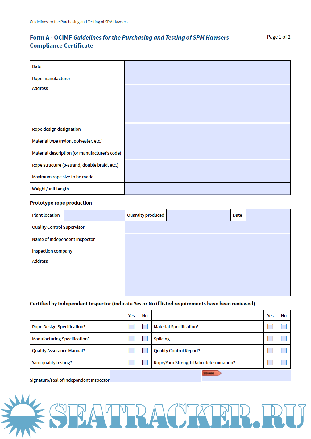• Form A OCIMF Guidelines for the Purchasing and Testing of SPM Hawsers Compliance Certificate