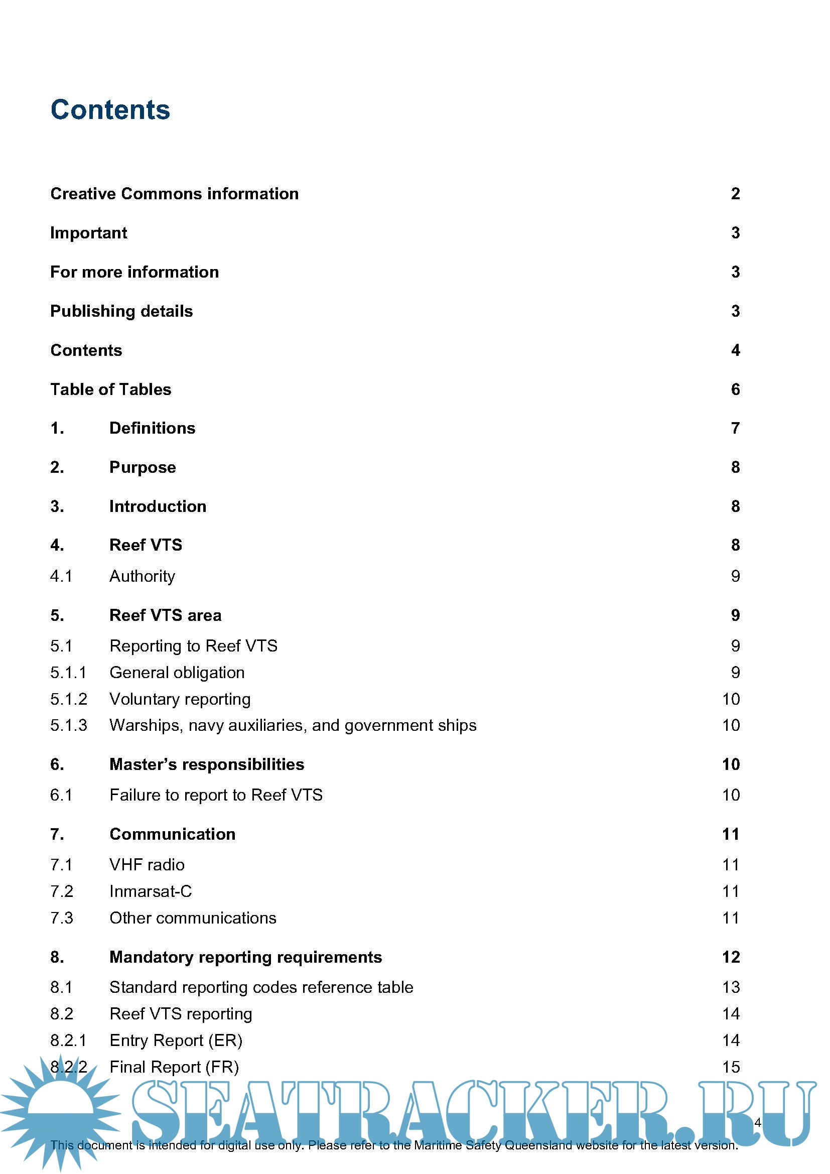 Year: 2025 Language: English Author: Department of Transport and Main Roads Genre: Guide Publisher: Maritime Safety Queensland Edition: 11th Edition 2025 Format: PDF Quality: eBook Pages count: 42 Description: The purpose of this guide is to assist masters of ships transiting the Reef VTS area on the services provided by Reef VTS. The guide describes: • The regulatory requirements for ships entering and transiting through the Reef VTS Area, including the mandatory reporting procedures, recommended shipping routes and compulsory pilotage areas; • Contact and communication requirements; and • The vessel traffic services provided by Reef VTS. The master of a ship is responsible for the ship’s operation and is responsible for the safe navigation of the ship under all circumstances. The information provided in the Reef VTS User Guide is a guide only. Any ship, owner, operator, charterer, master, or person directing the movement of a ship must still follow all relevant laws and regulations and must take any precautions required by ordinary seamanship or by the special circumstances of the case.
