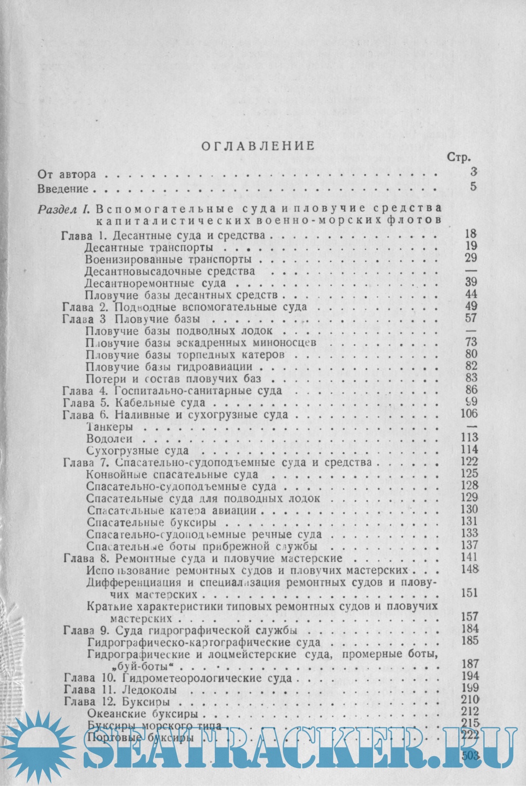 Оглавление От автора Введение Раздел I Вспомогательные суда и пловучие средства капиталистических военно-морских флотов Глава 1. Десантные суда и средства Десантные транспорты Военизированные транспорты Десантно-высадочные средства Десантно-ремонтные суда Пловучие базы десантных средств Глава 2. Подводные вспомогательные суда Глава 3 Пловучие базы Пловучие базы подводных лодок Пловучие базы эскадренных миноносцев Пловучие базы торпедных катеров Пловучие базы гидроавиации Потери и состав пловучих баз Глава 4. Госпитально-санитарные суда Глава 5. Кабельные суда Глава 6. Наливные и сухогрузные суда Танкеры Водолеи Сухогрузные суда Глава 7. Спасательно-судоподъемные суда и средства Конвойные спасательные суда Спасательно-судоподъемные суда Спасательные суда для подводных лодок Спасательные катера авиации Спасательные буксиры Спасательно-судоподъемные речные суда Спасательные боты прибрежной службы Глава 8. Ремонтные суда и пловучие мастерские Использование ремонтных судов и пловучих мастерских Дифференциация и специализация ремонтных судов и пловучих мастерских Краткие характеристики типовых ремонтных судов и пловучих мастерских Глава 9. Суда гидрографической службы Гидрографическо-картографические суда Гидрографические и лоцмейстерские суда, промерные боты, „буй-боты“ Глава 10. Гидрометеорологические суда Глава 11. Ледоколы Глава 12. Буксиры Океанские буксиры Буксиры морского типа Портовые буксиры Глава 13. Противопожарные пловучие средства Глава 14. Морские и речные баржи Глава 15. Базовые транспортные пловучие средства Глава 16. Доковые пловучие средства Буксировка пловучих Глава 17. Крановые пловучие средства Суда-краны и суда-тяжеловозы Новые типы кранов Глава 18. Пловучие щиты Щиты малого размера Щиты среднего размера Щиты большого размера Щиты для авиации и подводные Глава 19. Радиоуправляемые катера-цели Глава 20. Пловучие склады Глава 21. Зачистные пловучие станции Глава 22. Батопорты Глава 23. Пловучие средства бытового обслуживания Глава 24. Учебные, опытовые, бонозаградительные и другие вспомогательные суда Краткие выводы по разделу I Раздел II. Вспомогательные суда и пловучие средства сухопутных и воздушных сил Глава 25. Отдельные типовые суда и пловучие средства сухопутных и воздушных сил Краткие выводы по разделу II Раздел III. Мобилизованные корабли Глава 26. Торговые суда Торговые суда - вспомогательные крейсера Торговые суда - конвойные авианосцы Танкеры и зерновозы - „торговые авианосцы" MAC Транспорты - макеты боевых кораблей Торговые суда - прорыватели минных заграждений Торговые суда - сетевые заградители, сетевозы, боновозы Торговые суда - надводные минные заградители Торговые суда - корабли ПВО Торговые суда - штабные корабли Транспорты - корабли радиолокационного дозора Торговые суда - десантные корабли Суда каботажного плавания - досмотровые корабли Глава 27. Промысловые суда Китобойные суда - сторожевые корабли Траулеры - базовые тральщики Рыболовные суда - посты ПМО Строительство промысловых судов для военных целей Глава 28. Спортивные суда Краткие выводы по разделу III Раздел IV. Военизированные транспортные суда Глава 29. Использование военизированных транспортных судов „Блокадопрорыватели" Войсковые транспорты Суда-тяжеловозы Глава 30. Потери военизированных транспортных судов Краткие вы