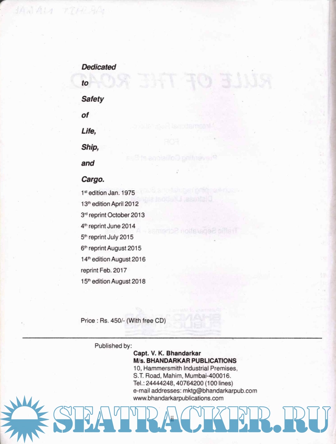 Year: 2018 Language: English Author: Capt. V.R. Bhandarkar Publisher: Bhandarkar Publications Edition: 15th Format: PDF Quality: Scanned pages Pages count: 220 Description: International Regulations for Preventing Collisions at Sea - Colregs updated regularly with relevant section of STCW code as adopted in 2010 IALA Buoyage System, Traffic Separation Schemes International Phonetics, Storm signals Distress and Lifeboat signals. Master the intricacies of maritime navigation with the IMO Rule of the Road book, your essential companion for understanding international regulations at sea. Whether you're a seasoned sailor or a maritime enthusiast, this meticulously crafted guide offers comprehensive insights into the rules governing ship navigation and safety worldwide. Navigating through international waters demands precision and adherence to established protocols. The IMO Rule of the Road book not only educates but empowers you to navigate confidently, promoting safety and compliance with global maritime regulations. Whether you're preparing for licensing exams or enhancing your maritime knowledge, this book is your definitive resource for mastering the rules that govern our oceans. Additional info: The acutal book comes with a CD. Not included in this post.