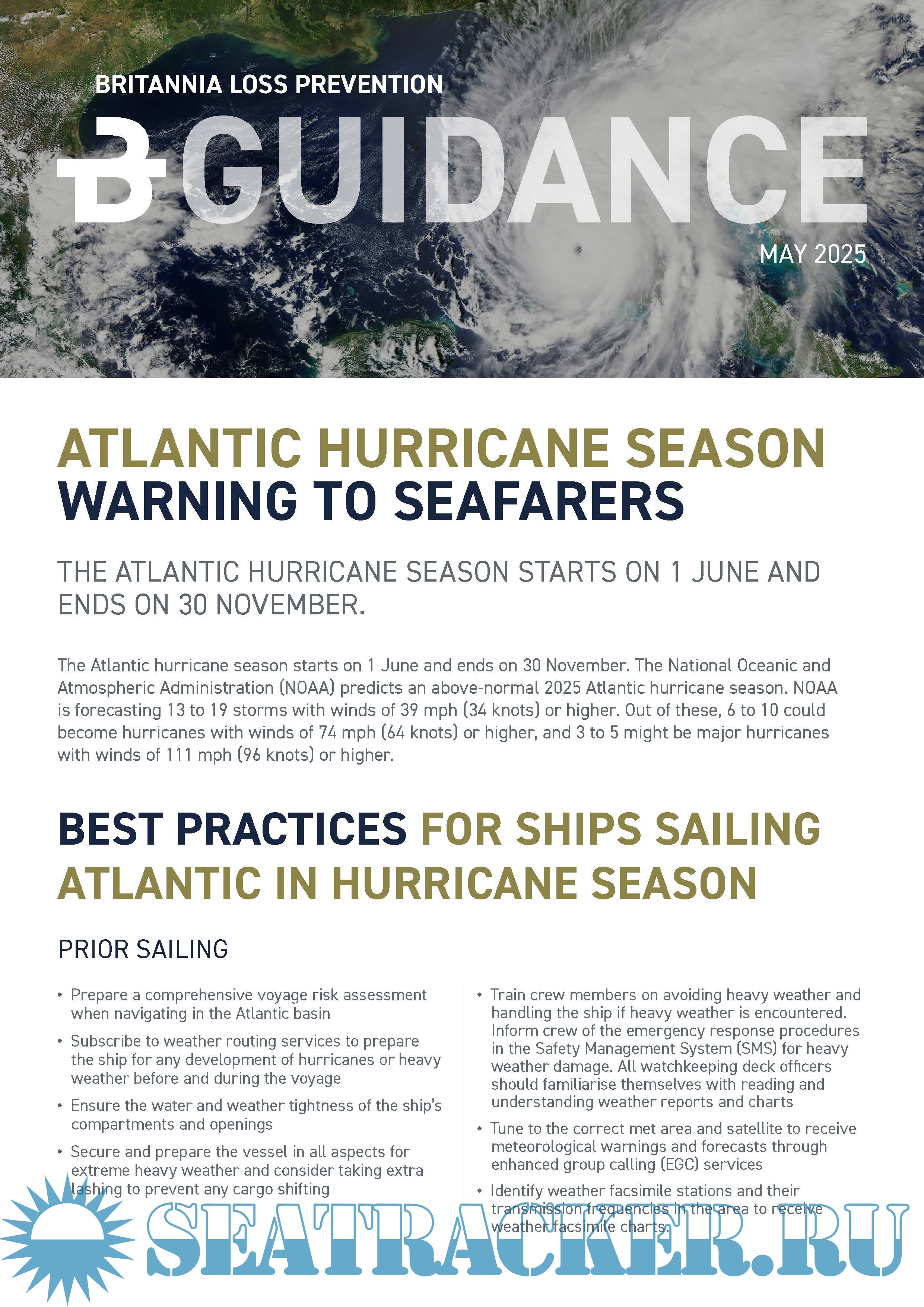 Year: 2025 Language: English Author: Britannia P&I Club Genre: Bulletin Publisher: Britannia P&I Club Edition: May 2025 Format: PDF Quality: eBook Pages count: 3 Description: Best practices for ships sailing Atlantic in Hurricane season. The Atlantic hurricane season starts on 1 June and ends on 30 November. The National Oceanic and Atmospheric Administration (NOAA) predicts an above-normal 2025 Atlantic hurricane season. NOAA is forecasting 13 to 19 storms with winds of 39 mph (34 knots) or higher. Out of these, 6 to 10 could become hurricanes with winds of 74 mph (64 knots) or higher, and 3 to 5 might be major hurricanes with winds of 111 mph (96 knots) or higher.