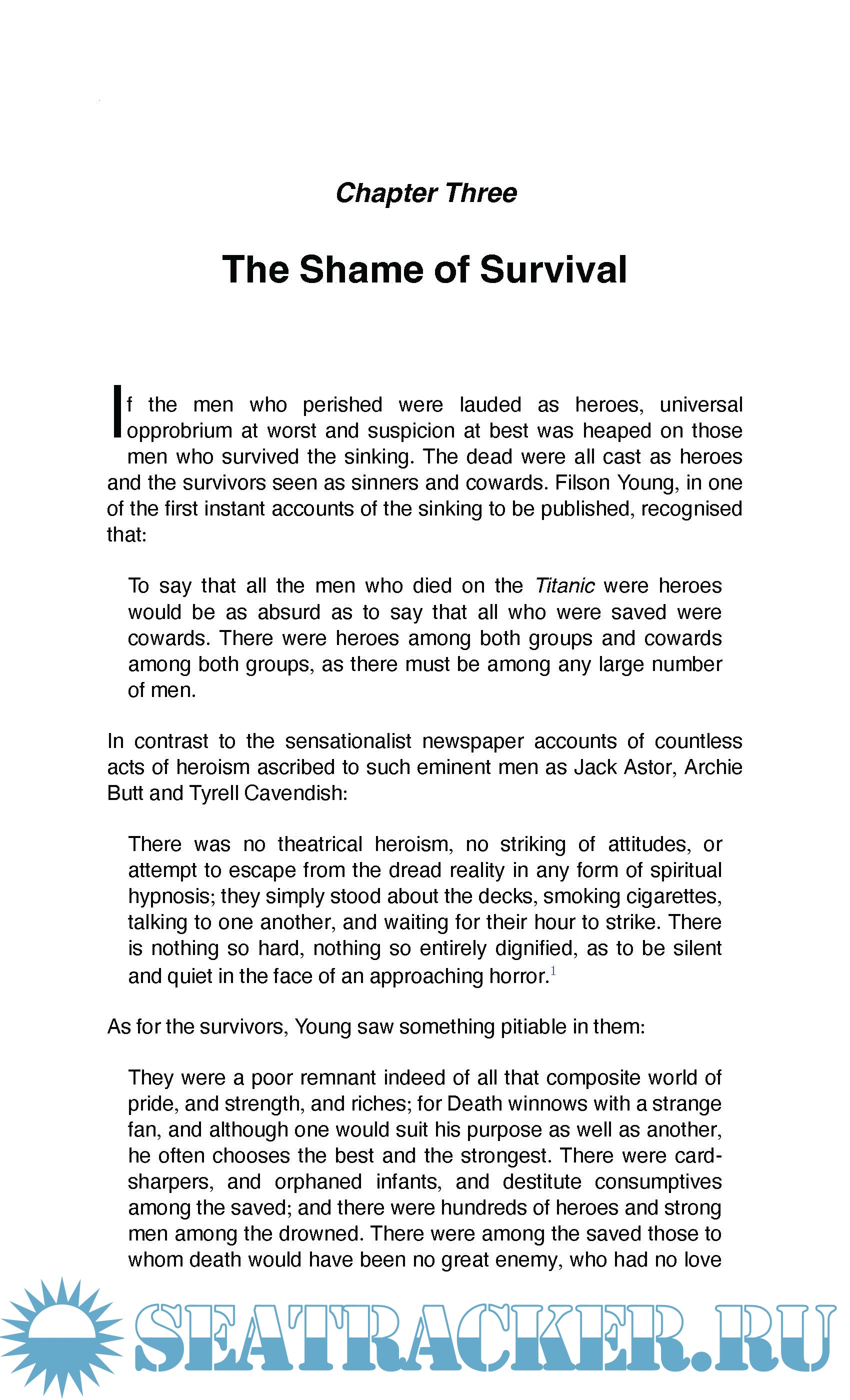 Eyewitness accounts evoke the horror of the night and reveal the underlying ideas of the day. They also show that women played a less passive role than expected of them. The responses to the sinking by politicians across the spectrum, the labour movement and suffragettes, suffragists and anti-suffragists is explored to show more critical contemporary responses to the disaster that challenge the heroic narrative. It was a world that was never so confident in modernity after the disaster but yet still held on to illusions of chivalry.