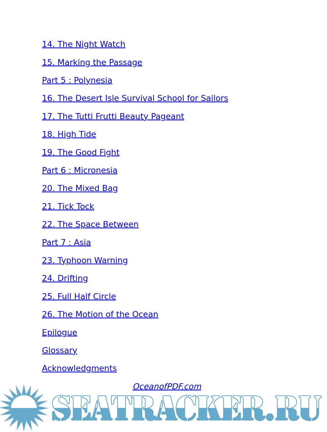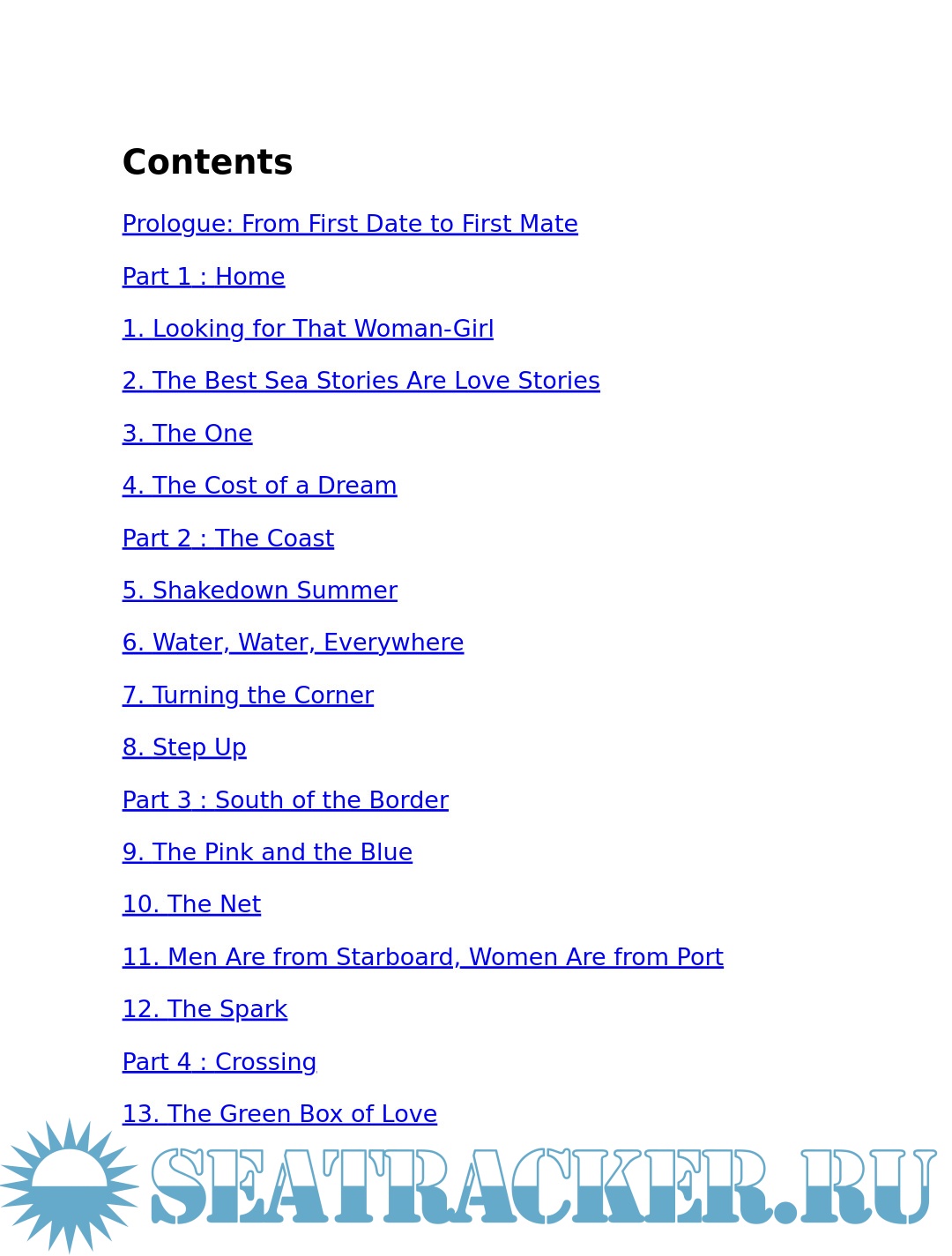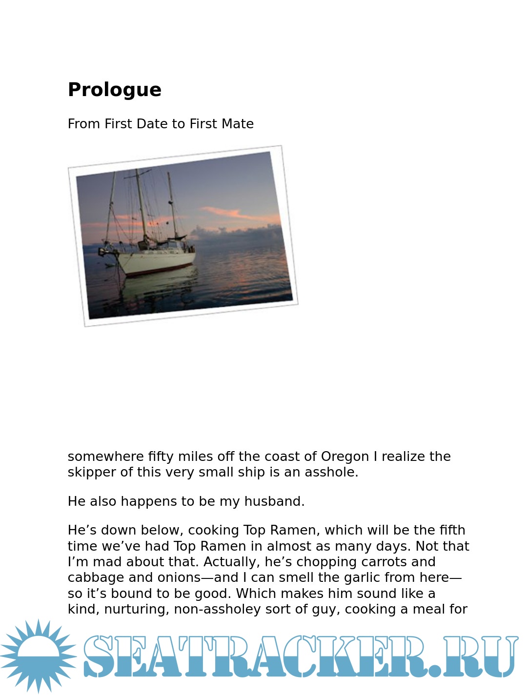 Year: 2009 Language: English Author: Esarey J.C. Genre: Historical Publisher: Touchstone ISBN: 978-1-4165-9681-3 Format: PDF, EPUB Quality: eBook Pages count: 445 Description: Choosing a mate is like picking house paint from one of those tiny color squares: You never know how it will look across a large expanse, or how it will change in different light. Meet Janna and Graeme. After a decade-long tango (together, apart, together, apart), they're back in love -- but the stress of nine-to-five is seriously hampering their happiness. So they quit their jobs, tie the knot, and untie the lines on a beat-up old sailboat for a most unusual honeymoon: a two-year voyage across the Pacific. But passage from first date to first mate is anything but smooth sailing. From the rugged Pacific Northwest coast to the blue lagoons of Polynesia to bustling Asian ports, Janna and Graeme find themselves at the mercy of poachers, under the spell of crossdressers, and under the gun of a less-than-sober tattooist. And they encounter do-or-die moments that threaten their safety, their sanity, and their marriage. Join Janna and Graeme's 17,000-mile journey and their quest to resolve the uncertainties so many couples face: How do you know if you've really found the One? How do you balance duty to others while preserving space for yourself? And, when the waters get rough, do you jump ship, or do you learn to navigate the world...together?