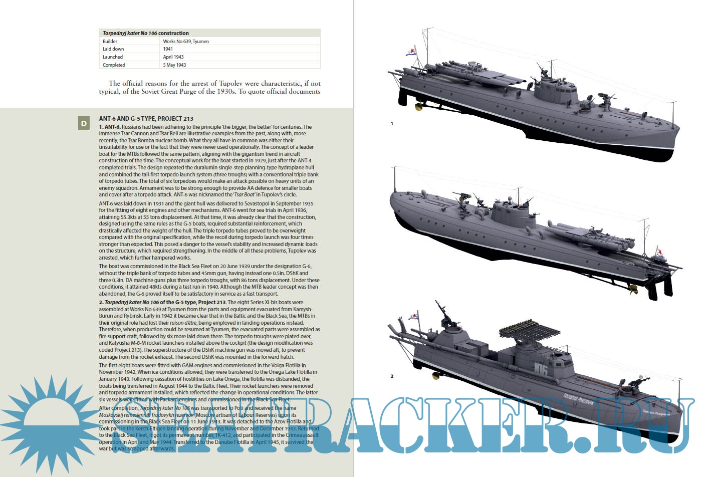 The Soviet Navy's fast attack craft were inspired by the 1919 Kronstadt raid, conducted by British hydroplaning, torpedo-armed Coastal Motor Boats (CMBs). The first were to be CMB copies, but with Soviet shipbuilding incapable of the project, it was handed to the Aerodynamic Institute, headed by Andrey Tupolev. Built with aircraft engines and technology, his 50kt boats were as photogenic as they were bumpy and noisy, and made a vivid impression on propaganda newsreels. Some were adapted with remote control guidance, a pioneering development of the naval drone.