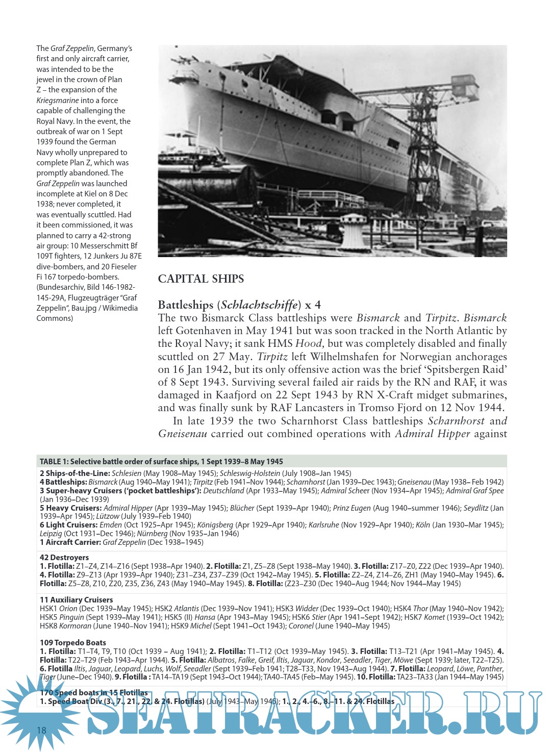 Founded in defiance of the Treaty of Versailles, the Kriegsmarine was established in 1935 and reached a peak strength of more than 800,000 personnel in 1944. Its original aim of amassing a surface fleet on parity with Great Britain's Royal Navy shifted with the outbreak of World War II, after which focus moved to submarine warfare, with the Kriegsmarine's U-boats exacting a heavy toll on Allied shipping across the globe. Meanwhile, several of its formidable capital ships – notably the Graf Spee, Bismarck, Tirpitz, Scharnhorst and Gneisenau – saw widespread action as Nazi Germany strove to defeat the Allies at sea.