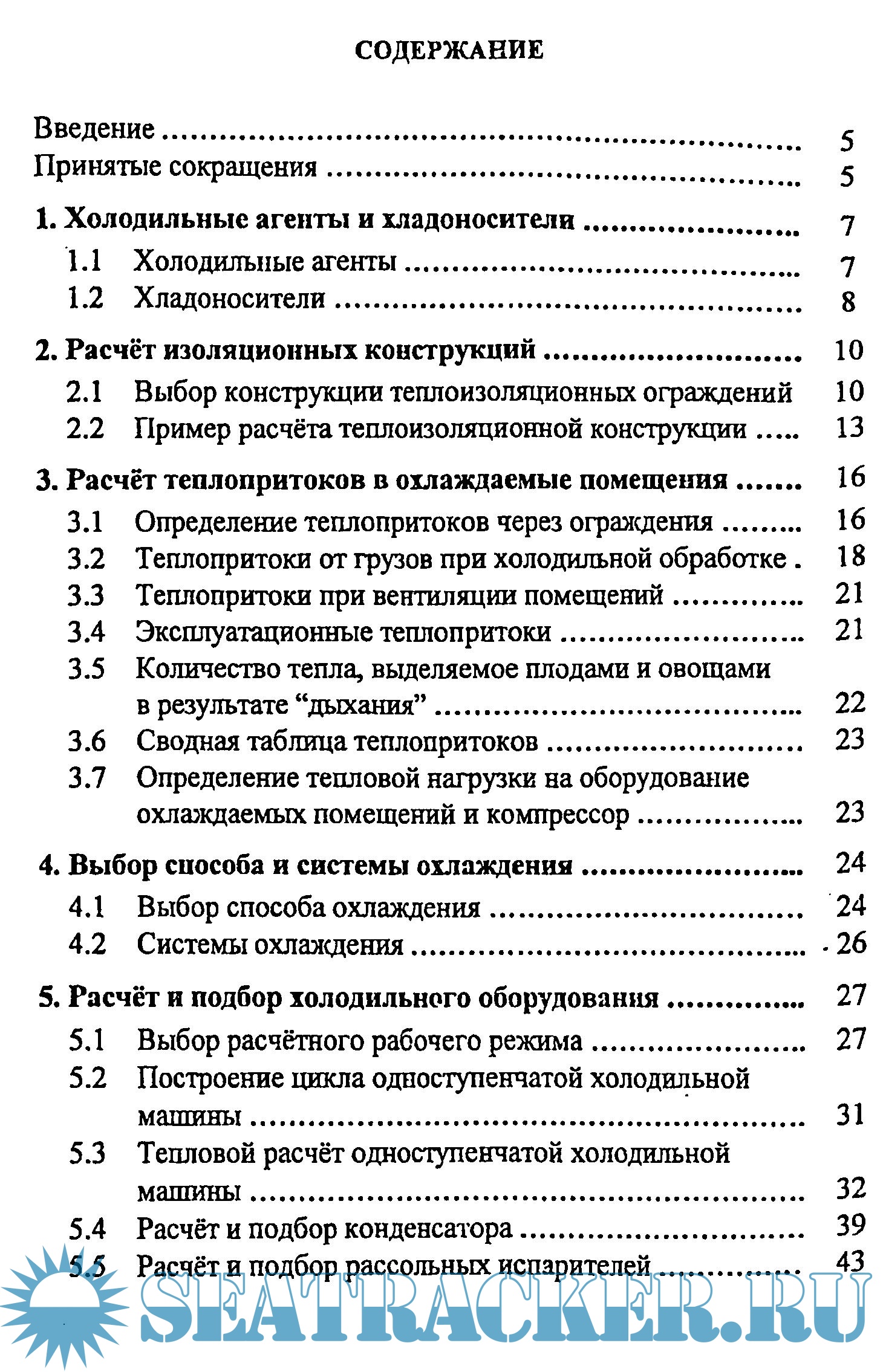 Рассматриваются холодильные агенты и хладоносители, требования к ним, физические свойства; выбор конструкции теплоизоляционных ограждений и определение коэффициента теплопередачи для каждого изолированного ограждения с использованием его в дальнейшем при расчёте теплопритоков в охлаждаемые помещения. Дана методика расчёта теплопритоков и таблицы куда сводят их результаты. Даны также выбор способа и системы охлаждения, после чего производится расчёт и подбор основных и вспомогательных элементов холодильной установки, характеристики которых приводятся в таблицах. Рассмотрены различные принципиальные схемы судовых холодильных установок.