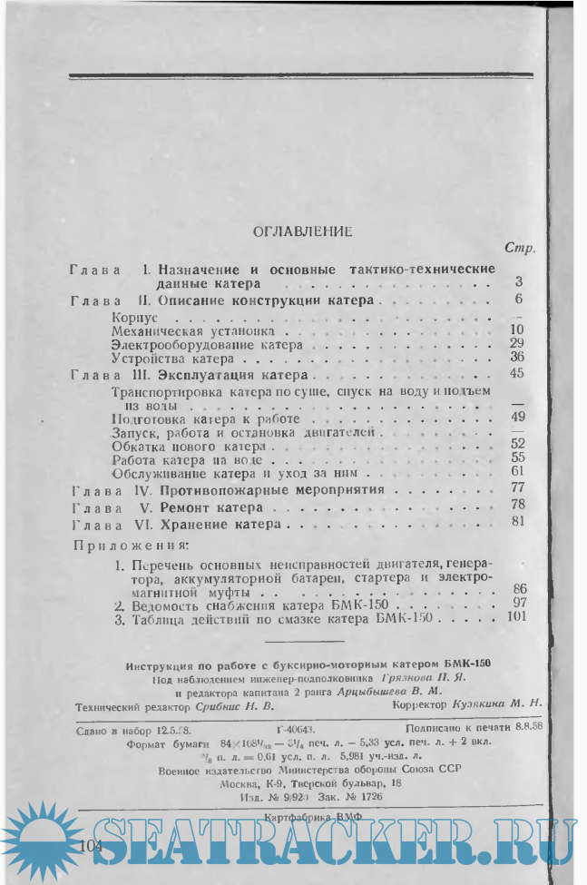 Год выпуска: 1958 Язык: Русский Автор: N/A Издательство: Военное Издательство Министерства Обороны Союза ССР Формат: PDF Качество: Отсканированные страницы + слой распознанного текста Количество страниц: 107 Описание: БМК-150 - буксирно-моторный катер. Буксирно-моторный катер БМК-150 предназначен для обслуживания понтонных парков, а также для выполнения различных вспомогательных работ. Катер входил в состав понтонных парков ЛПП, ТПП, ПМП.