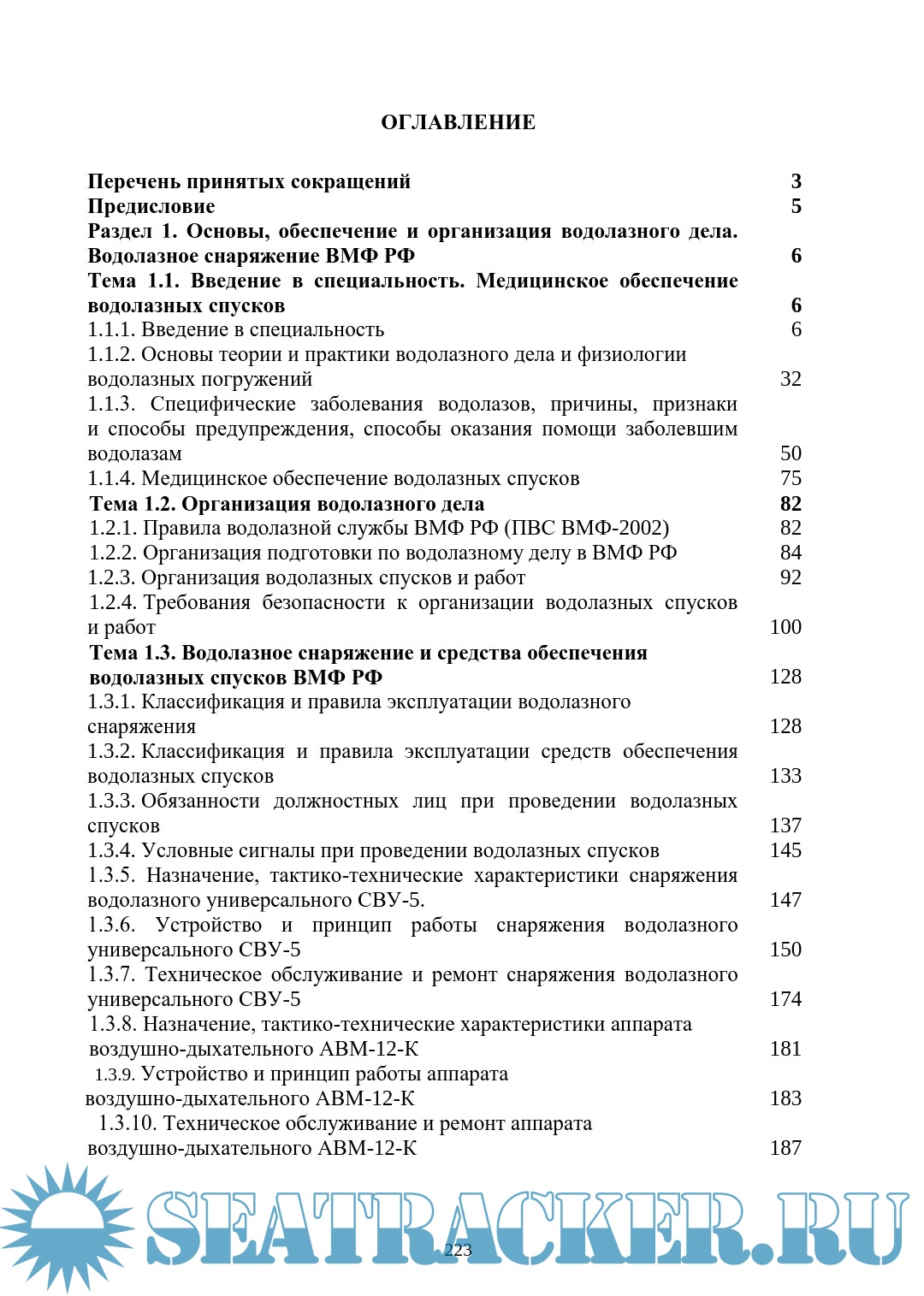 Описание: В учебном пособии с современных позиций изложены в строгом соответствии с тематическим планом учебной дисциплины «Водолазная подготовка»: основы теории и практики водолазного дела и физиологии водолазных погружений, специфические заболевания водолазов, причины, признаки и способы предупреждения, способы оказания помощи заболевшим водолазам, медицинское обеспечение водолазных спусков, Правила водолазной службы ВМФ РФ, организация подготовки по водолазному делу в ВМФ РФ, организация водолазных спусков и работ, требования безопасности к организации водолазных спусков и работ, классификация и правила эксплуатации водолазного снаряжения, классификация и правила эксплуатации средств обеспечения водолазных спусков, обязанности должностных лиц при проведении водолазных спусков, условные сигналы при проведении водолазных спусков, назначение, тактико-технические характеристики снаряжения водолазного универсального СВУ-5, устройство и принцип работы снаряжения водолазного универсального СВУ-5, техническое обслуживание и ремонт снаряжения водо-лазного универсального СВУ-5, назначение, тактико-технические характеристики аппарата воздушно-дыхательного АВМ-12-К, устройство и принцип работы аппарата воздушно-дыхательного АВМ-12-К, техническое обслуживание и ремонт аппарата воздушно-дыхательного АВМ-12-К, подготовка к спуску и проверка снаряжения водолазного универсального, проведение рабочей проверки снаряжения водолазного универсального СВУ-5, проведение рабочей проверки аппарата воздушно-дыхательного АВМ-12-К, одевание (раздевание) водолаза, командование учебными водолазными спусками на глубины до 20 метров, выбор режима декомпрессии, отработка сигналов связи с водолазом.
