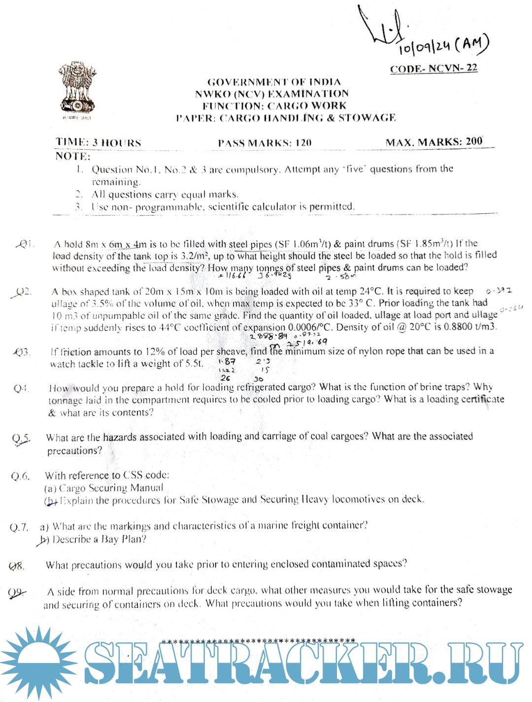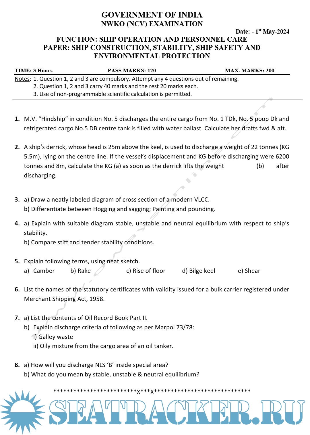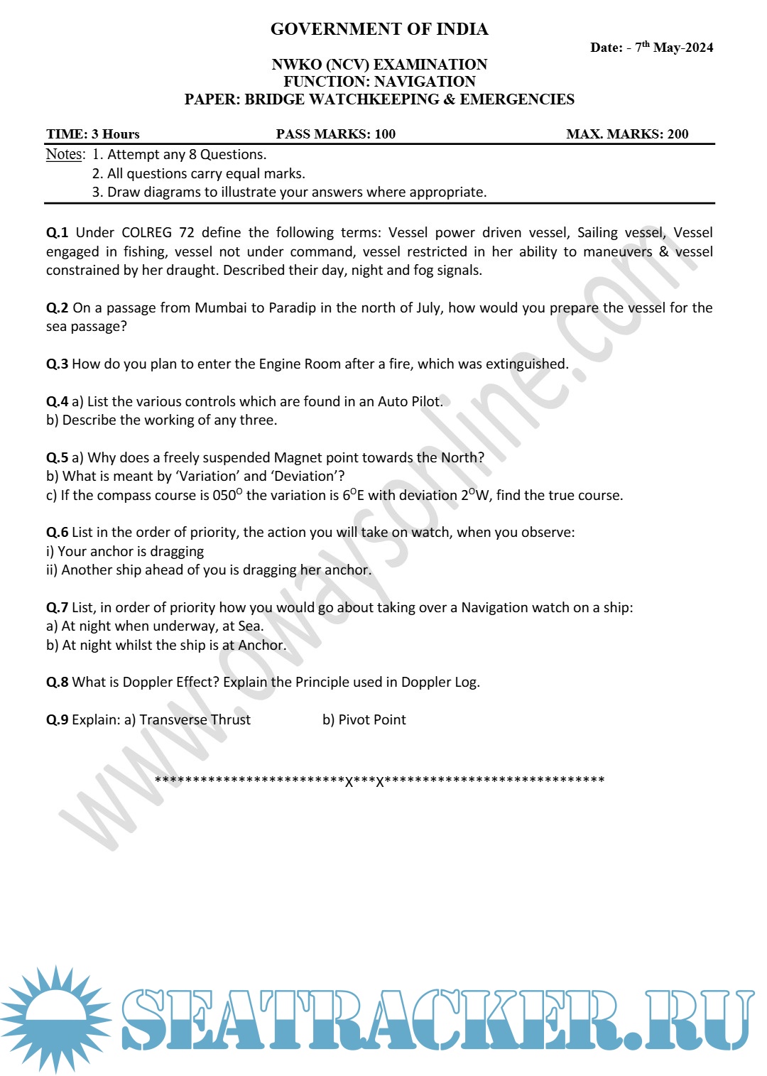 Question Paper Set (September 2024) for NWKO (NCV) Mercantile Marine Department (MMD), India Examinations