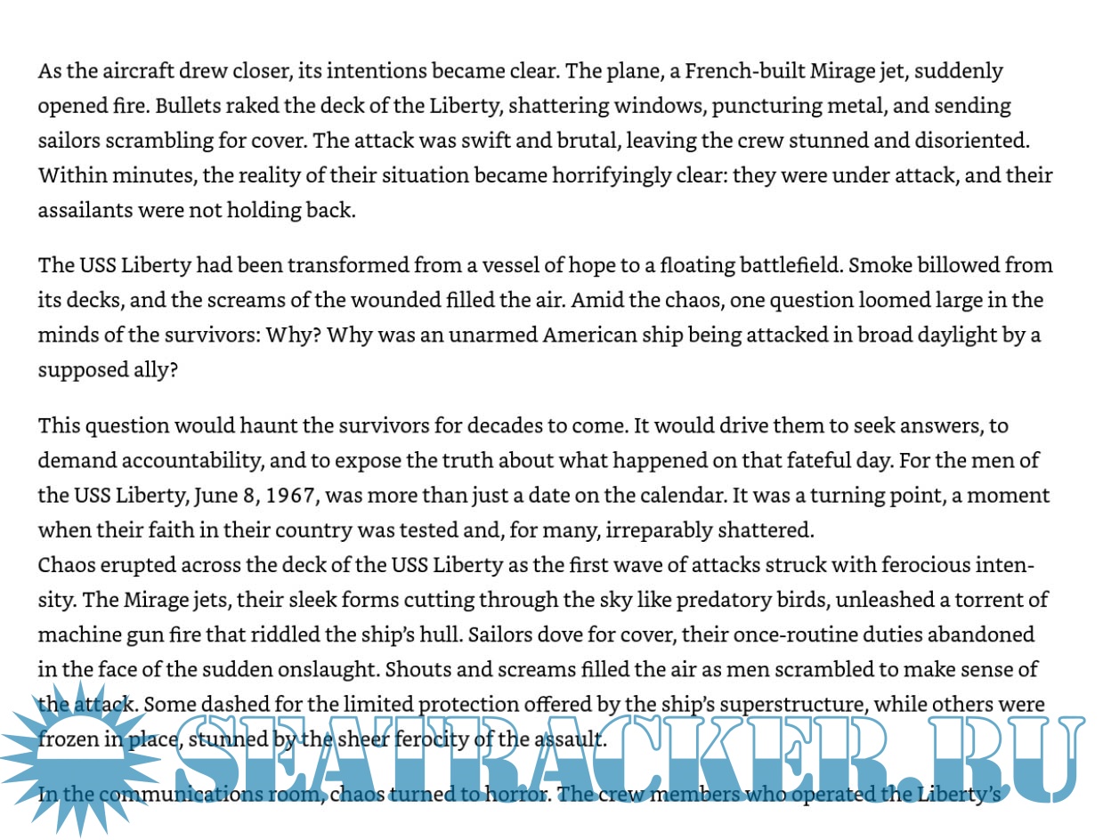 The USS Liberty, an American intelligence ship stationed in international waters near the Sinai Peninsula, was suddenly and brutally attacked by Israeli forces. Despite its clear markings and neutral position, the ship endured an onslaught of bombs, torpedoes, and machine-gun fire, resulting in the loss of 34 crew members and injuries to 171 others. Survivors of the attack recount the chaos, bravery, and determination that kept the ship afloat against all odds.