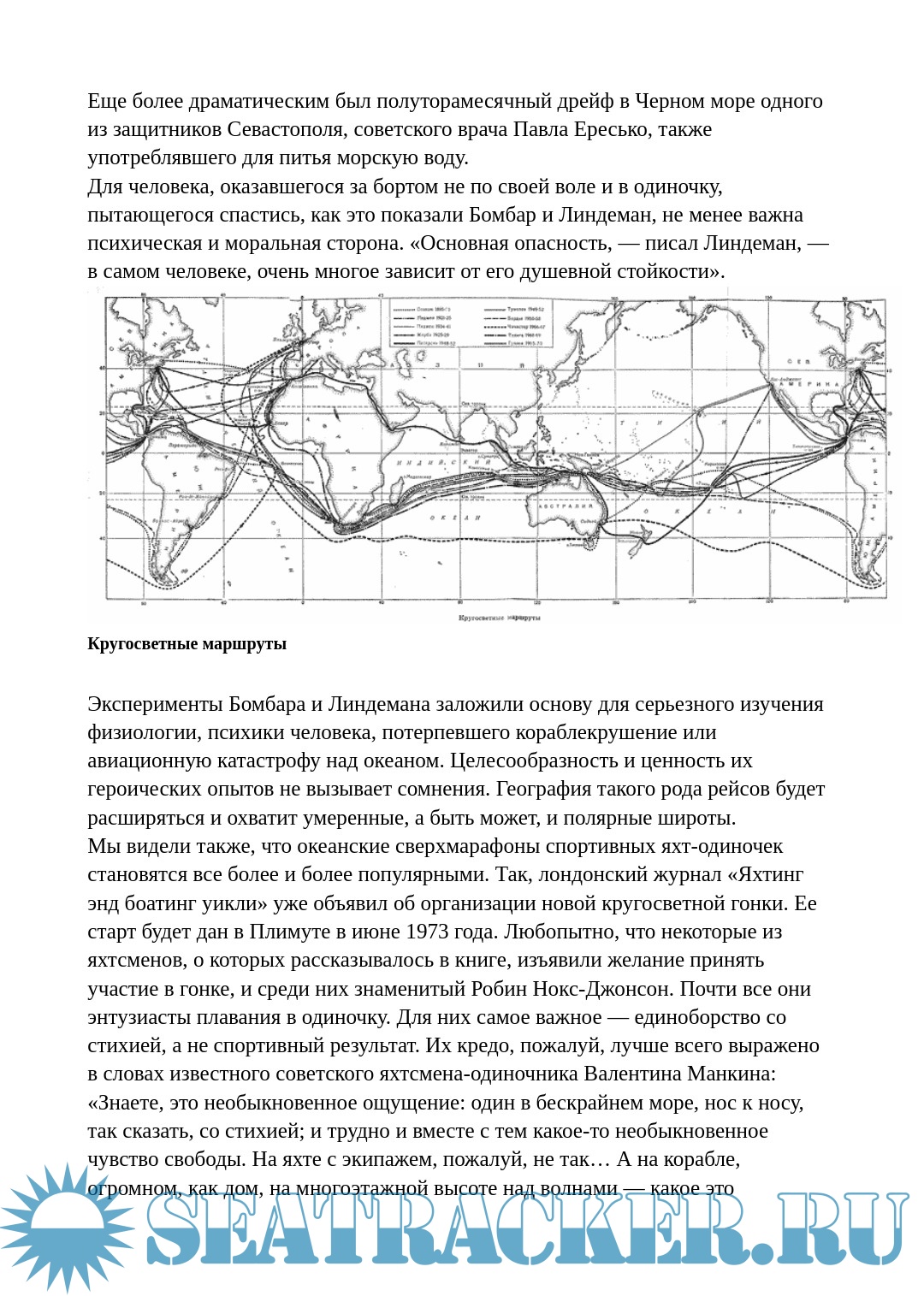 Читатель узнает о пересечении Атлантического океана Енсеном и Блэкберном, Бомбаром и Линдеманом, Чичестером и Табарли, о плаваниях через Тихий океан Уиллиса и Хори, о кругосветных плаваниях Слокама, Шербо, Пиджена, Телиги, Грэхема и о многих других, связанных с большим риском и необыкновенным мужеством.