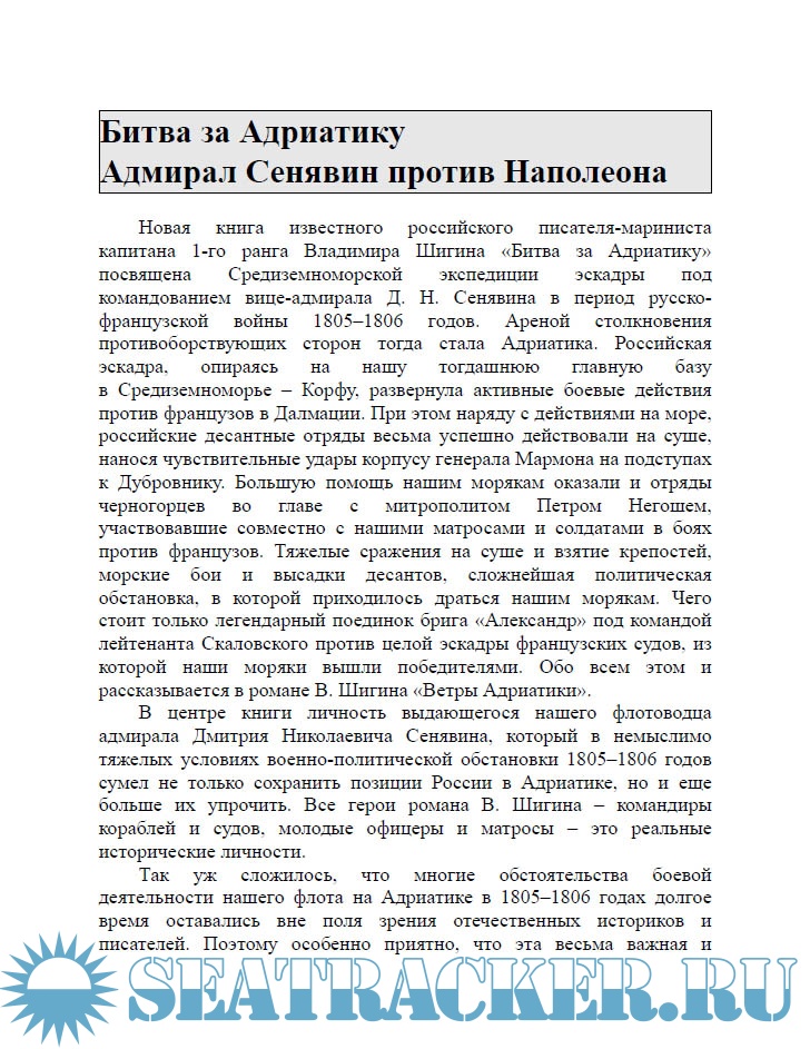 Описание: Книга известного российского писателя-мариниста Владимира Шигина посвящена боевым действиям Средиземноморской эскадры вице-адмирала Д. Н. Сенявина против Франции в 1805–1806 гг. В ходе нескольких удачных операций была освобождена Далмация и защищена Черногория. Среди героев книги император Александр