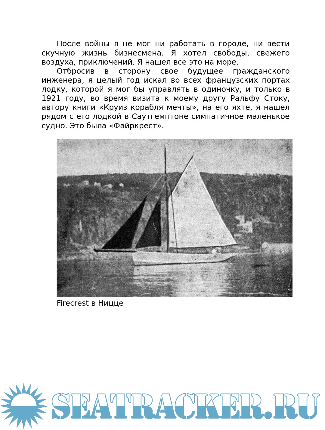 Описание: Ален Жербо (1893-1941) французский моряк, писатель и чемпион по теннису, совершивший кругосветное плавание в одиночку. В конце концов он осел на островах южной части Тихого океана, где написал несколько книг об образе жизни островитян. В книге «The fight of the Firecrest» (Битва Файркреста) он описывает своё одиночное плавание через Атлантику на яхте «Файркрест» из Гибралтара в Нью-Йорк в 1923 году за 101 день.