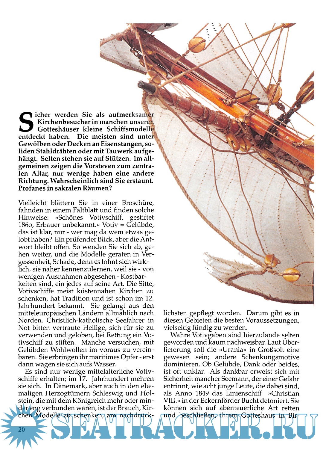 Description: Sicher werden Sie als aufm Kirchenbesucher in manchen Gotteshäuser kleine Schiffsmod entdeckt haben. Die meisten sind un Gewölben oder Decken an Eisenstangen, soliden Stahldrähten oder mit Tauwerk aufgehängt. Selten stehen sie auf Stützen. Im allgemeinen zeigen die Vorsteven zum zentralen Altar, nur wenige haben eine andere Richtung. Wahrscheinlich sind Sie erstaunt.