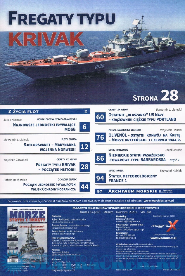 Description: Польский морской журнал. Издается с 1996 года, первоначально как ежеквартальный. С 1999 года издается раз в два месяца, а с 2007 года-как ежемесячный. Первоначально назывался Morza Statki i Okrety, в 2006 году переименован в Morze Statki i Okrety. С 2004 года полностью цветной (ранее только вставки). В 2008 году стали издаваться специальные выпуски, первоначально нерегулярные. С 2014 года выпускается как обычное издание и специальное издание, с непрерывной нумерацией.