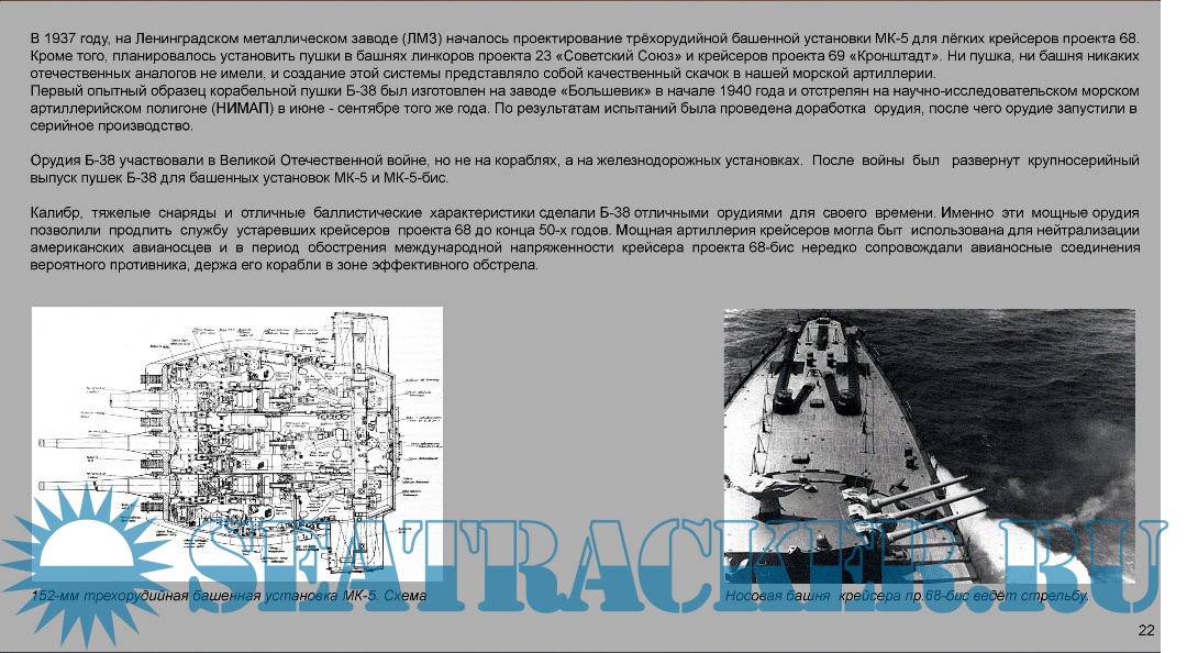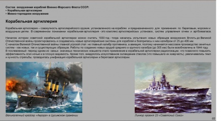 Описание: Сотрудником филиала Центрального военно-морского музея на крейсере "Аврора" К. Г. Мюллером к 75-летию Победы в Великой Отечественной войне подготовлена электронная выставка "Вооружение Военно-Морского Флота СССР. 1930-1960". Она представляет собой информационные слайды, повествующие о становлении советской корабельной артиллерии и минно-торпедного вооружения.