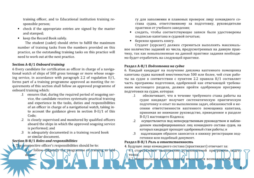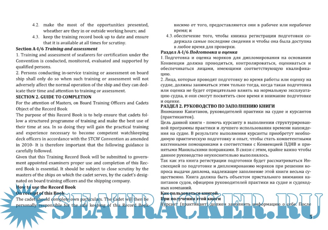 Описание: Книга регистрации практической подготовки предназначена для документирования судовой практики вахтенного помощника капитана (практиканта-судоводителя) в соответствии с требованиями Конвенции ПДНВ-78 с поправками. В ней фиксируются все учебные мероприятия, навыки, оценки и подтверждения со стороны квалифицированных офицеров и капитана судна. Книга обеспечивает подготовку к сертификации на должность офицера, ответственного за навигационную вахту на судах валовой вместимостью 500 рег. тонн и более, поддерживает высокий уровень профессиональных компетенций и соблюдение международных стандартов безопасности на море.-The onboard training record book is designed to document the practical training of deck cadets in compliance with the STCW Convention 1978, as amended. It records all training activities, skills, assessments, and endorsements by qualified officers and the ship’s master. The book supports preparation for certification as an Officer in Charge of a Navigational Watch on ships of 500 gross tonnage or more, ensuring professional competence and adherence to international maritime safety standards.