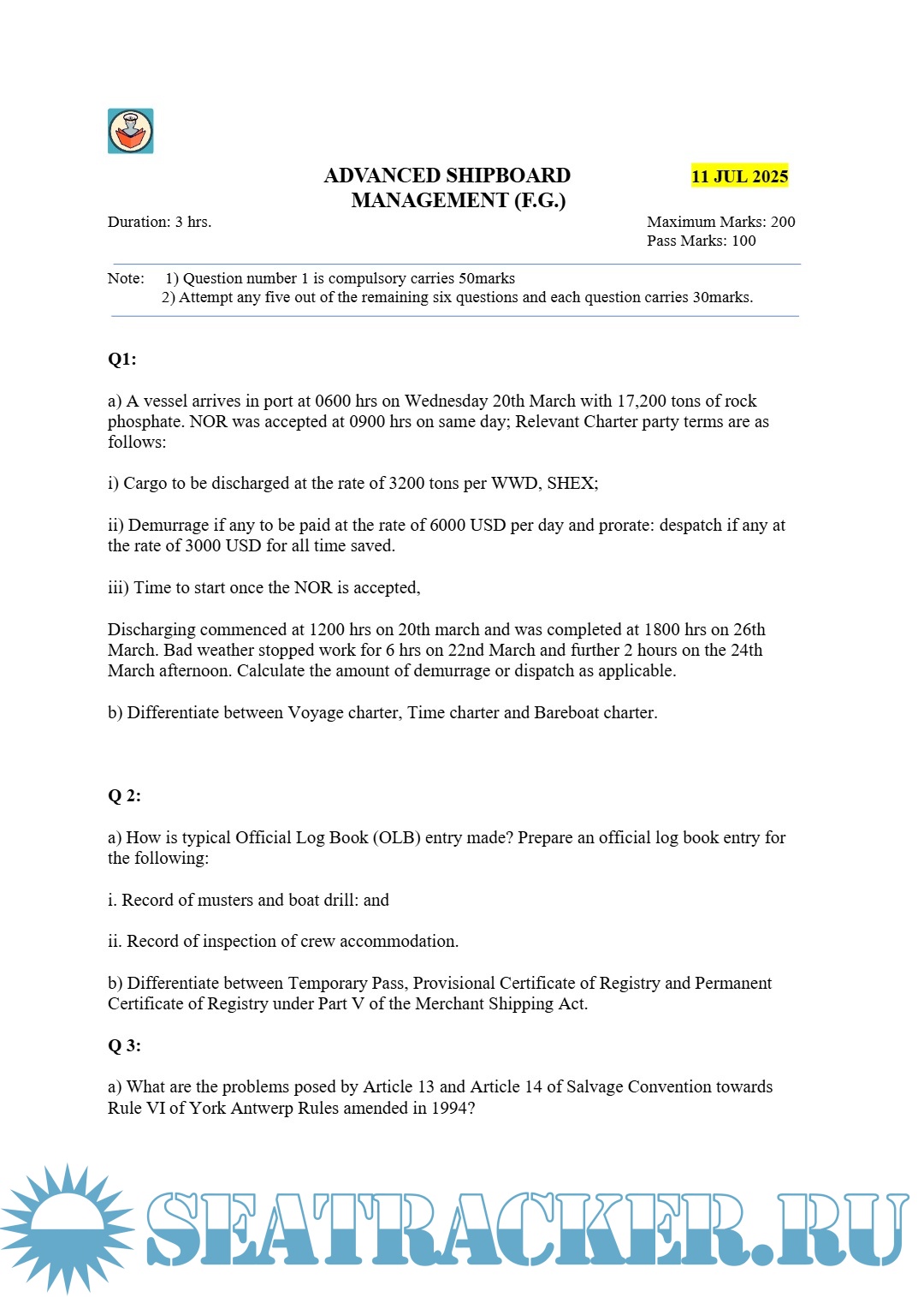 Question Paper Set for (ASM) Advanced Shipboard Management (September 2025) for Master's Examinations, Mercantile Marine Department (MMD), India