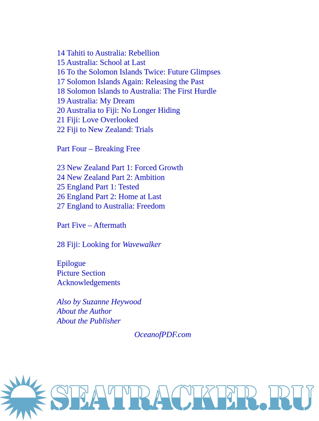 Aged just seven, Suzanne Heywood set sail with her parents and brother on a three-year voyage around the world. What followed turned instead into a decade-long way of life, through storms, shipwrecks, reefs and isolation, with little formal schooling. No one else knew where they were most of the time and no state showed any interest in what was happening to the children. Suzanne fought her parents, longing to return to England and to education and stability. This memoir covers her astonishing upbringing, a survival story of a child deprived of safety, friendships, schooling and occasionally drinking water…