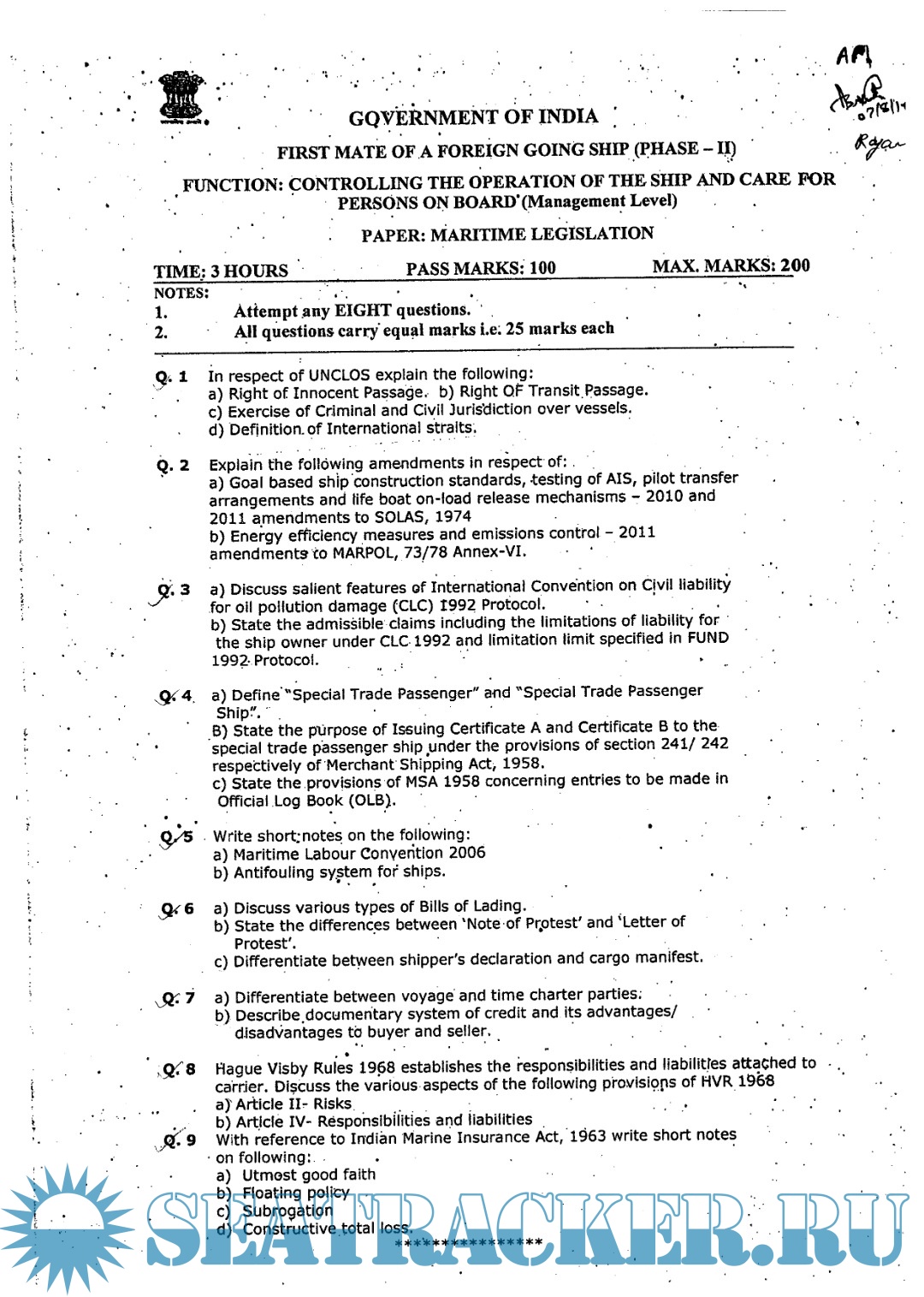 Question Paper Set for Maritime Legislation (November) Phase II (Chief Mate F.G.) Mercantile Marine…