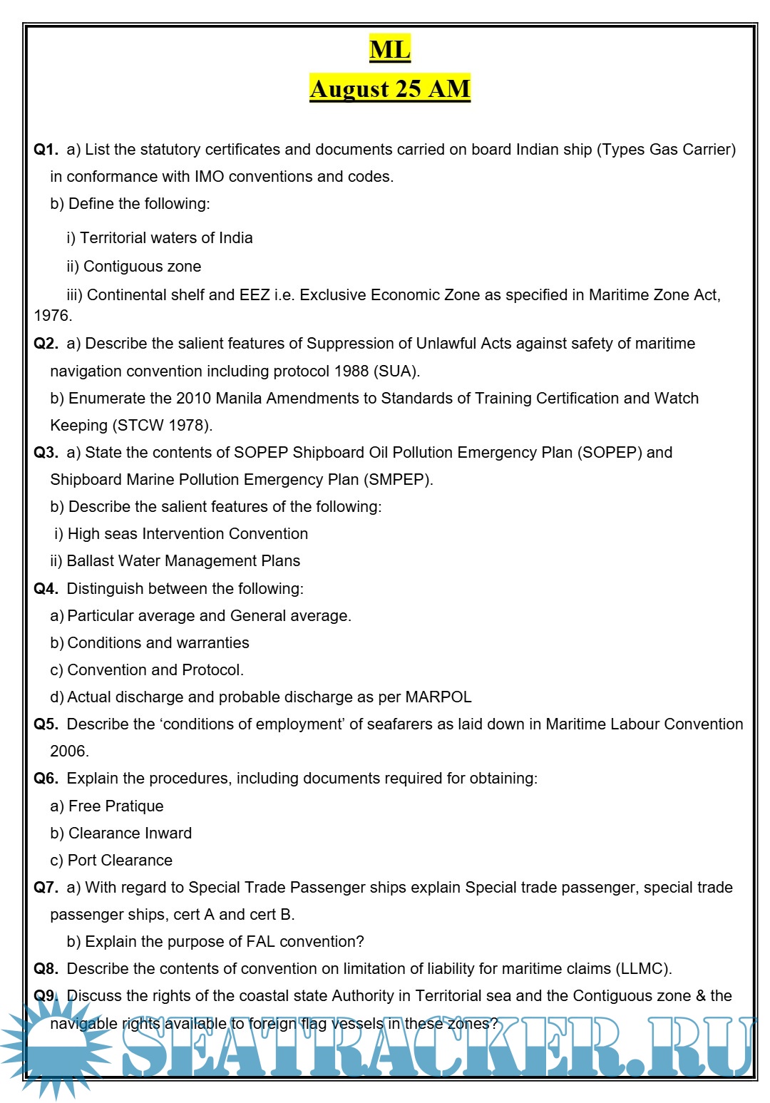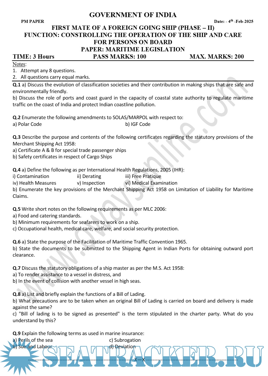 Question Paper Set Maritime Legislation (August 2025) Phase II (Chief Mate F.G.) Mercantile Marine Department (MMD), India Examinations