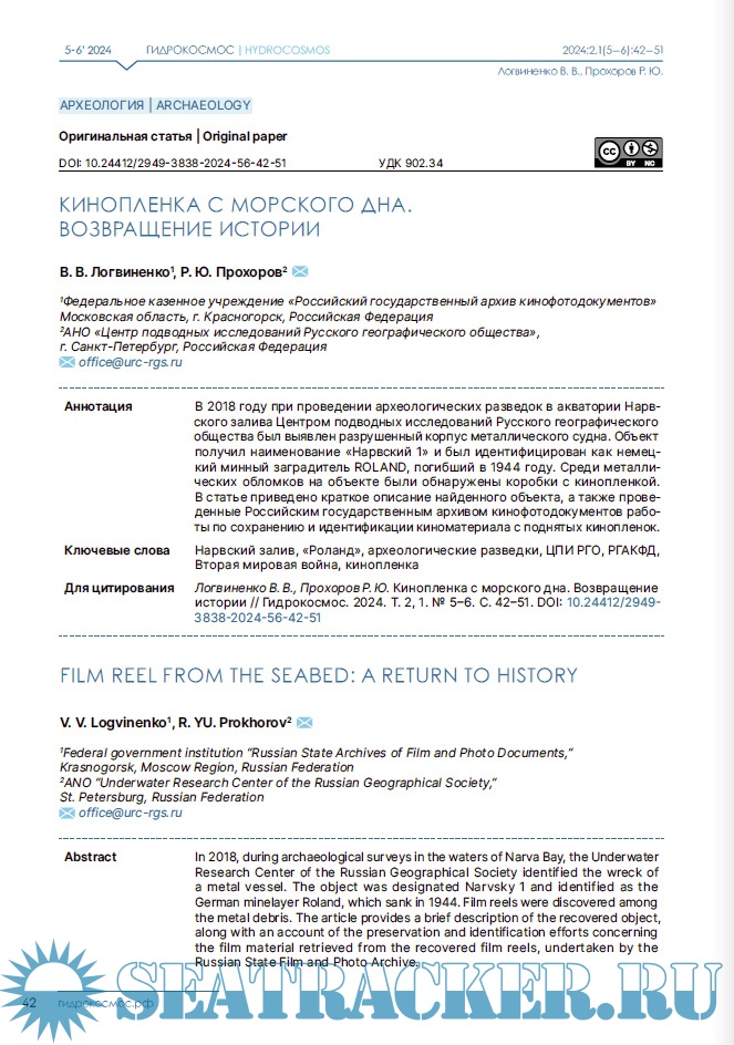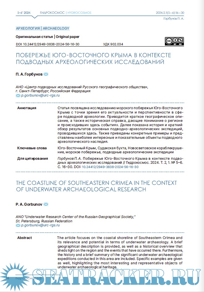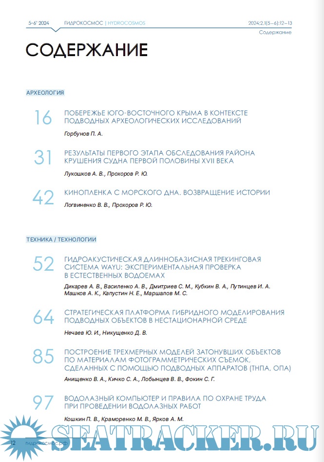Описание: Научный журнал «Гидрокосмос» — первое в России междисциплинарное издание о подводных исследованиях. Он задуман как площадка для обсуждения научных проблем изучения свидетельств взаимодействия людей с морями, озерами и реками, исследованиям смежных занятий и ремесел, а также ныне затопленных участков суши. В повестку издания входят теоретические и методологические вопросы подводных исследований; проблемы морской археологии, связанные с консервацией и реставрацией предметов, обнаруженных в воде; вопросы сохранности объектов культурного наследия; вопросы технического, медицинского, организационного и юридического обеспечения подводных археологических работ. Журнал «Гидрокосмос» создан как инструмент для укрепления сообщества теоретиков и практиков подводных исследований, для обеспечения синергии в дальнейшем развитии отрасли в России.