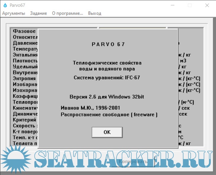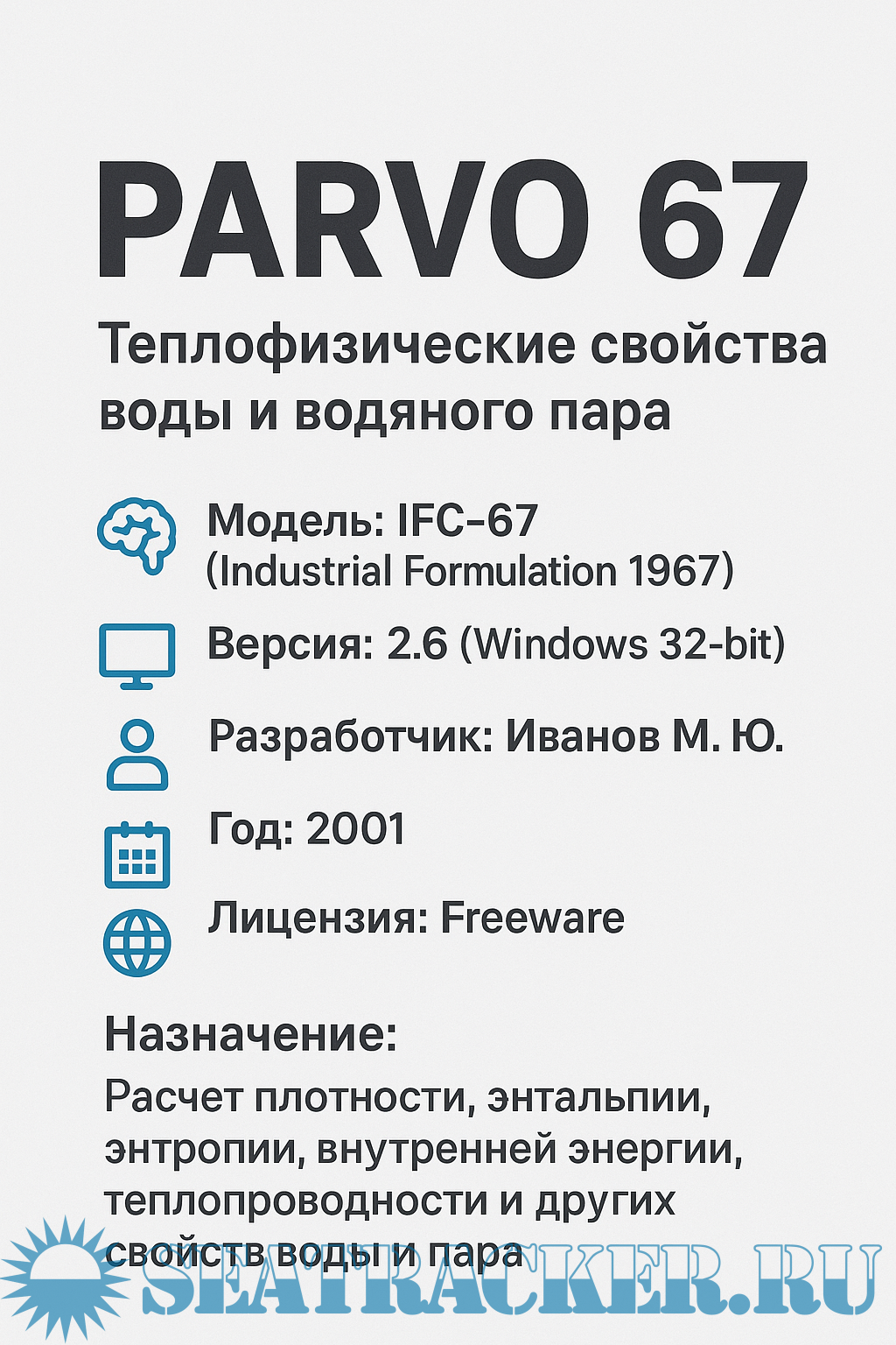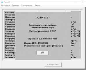Описание: Программа PARVO 67 реализует расчёт термодинамических и теплофизических свойств воды и водяного пара в широком диапазоне температур и давлений на основе стандартной формулы **IFC-67**, принятой в 1967 году для промышленного применения (принята как основа «ASME Steam Tables»). :contentReference[oaicite:0]{index=0}