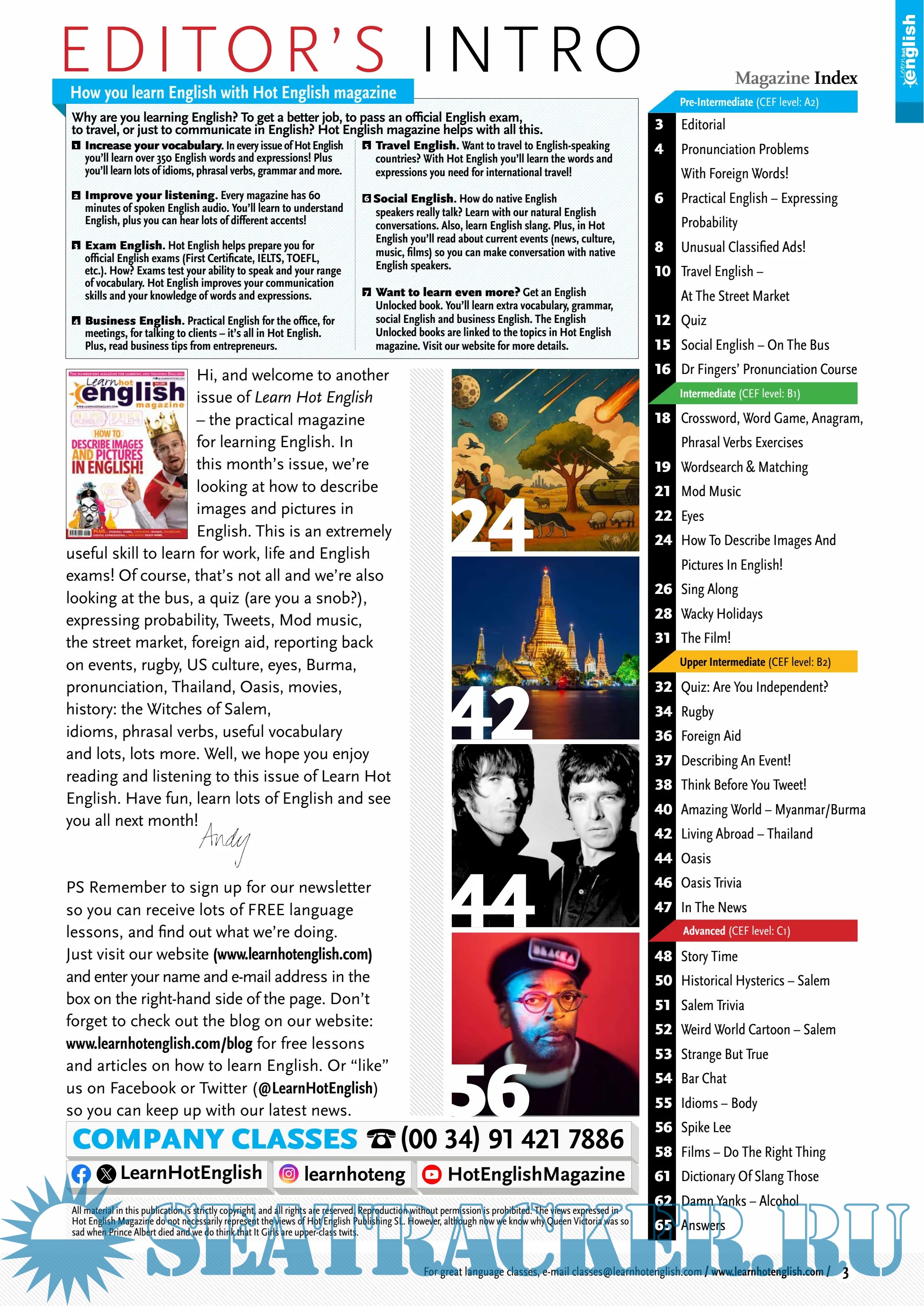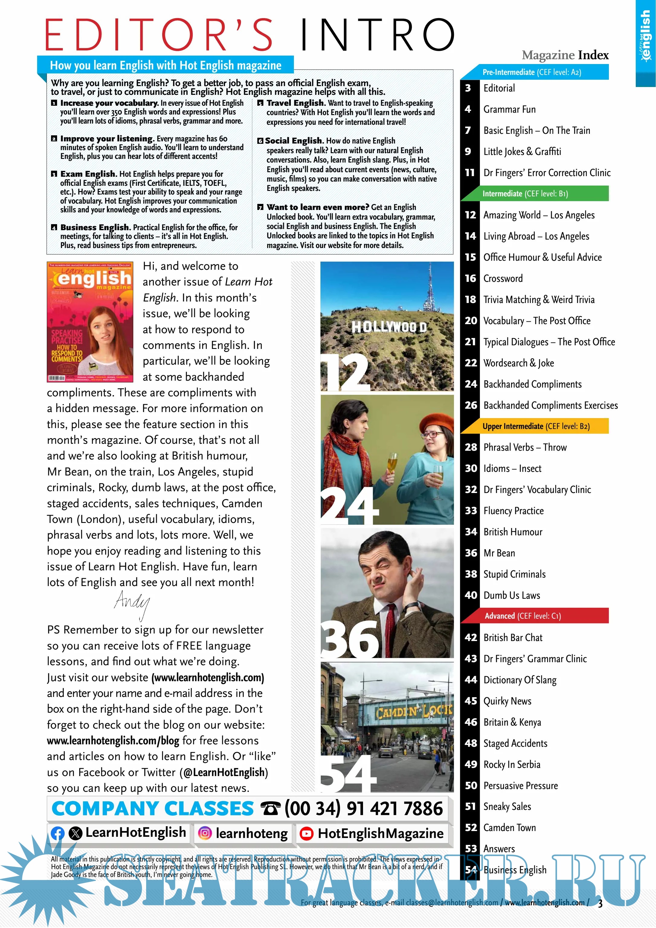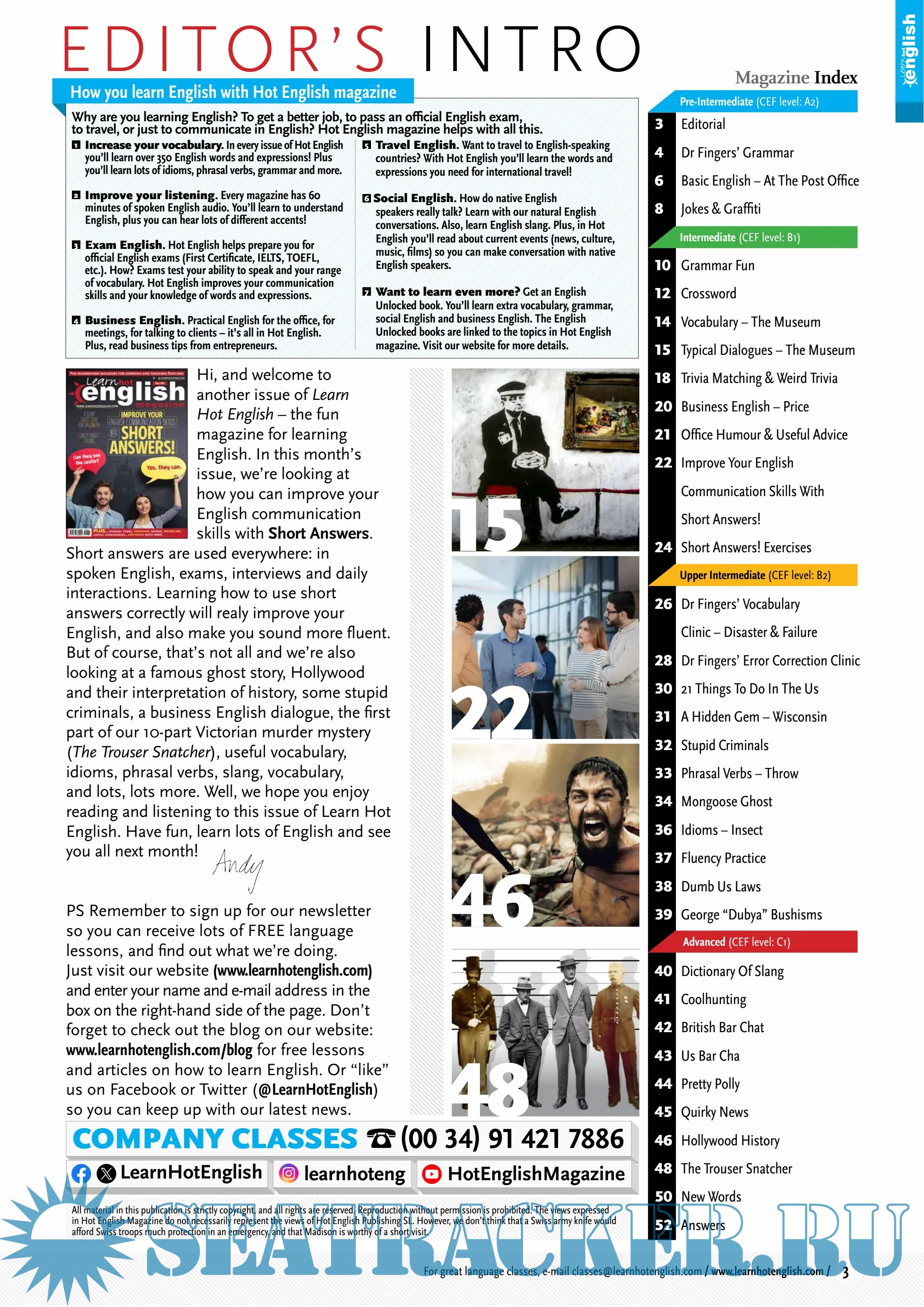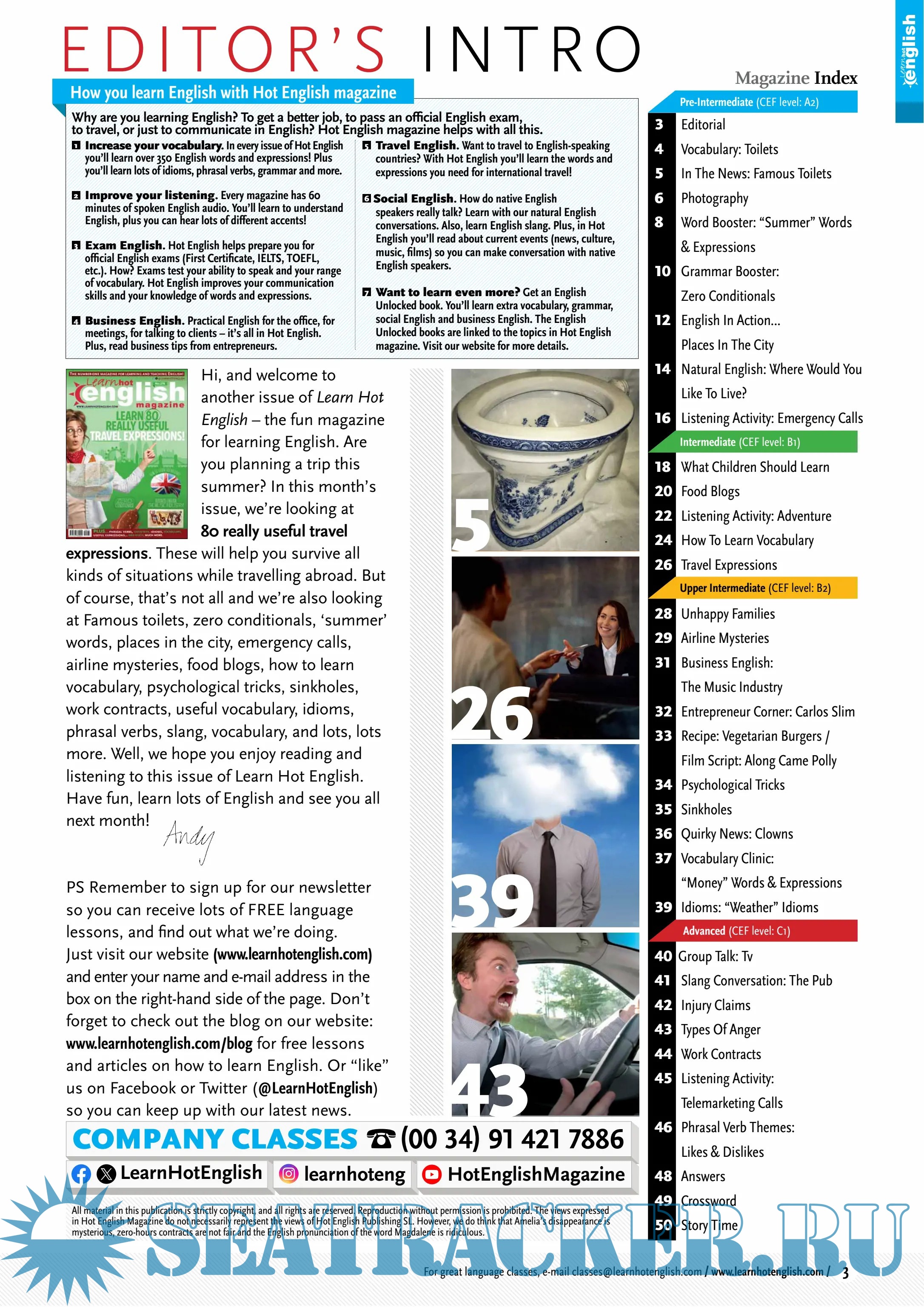 English for all levels (easy – advanced). A monthly magazine for learning English. Idioms, phrasal verbs, useful expressions, grammar, vocabulary. Learn faster because it’s fun! Studying English for an exam, work, or fun? Then Hot English is number 1!