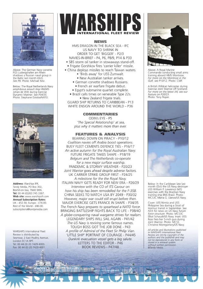 Description: Warships IFR puts the spotlight on the latest developments in the world’s navies. It covers current defence issues and has comments by leading analysts. The magazine regularly includes features on the Royal Navy and the US Navy in addition to incorporating news and features on all other navies across the globe. Warships IFR frequently carries in-depth articles on naval heritage.WARSHIPS International Fleet Review is published 12 times a year by Tandy Media Ltd who also publish Shipping Today & Yesterday (which provides news and features from the world of merchant shipping).