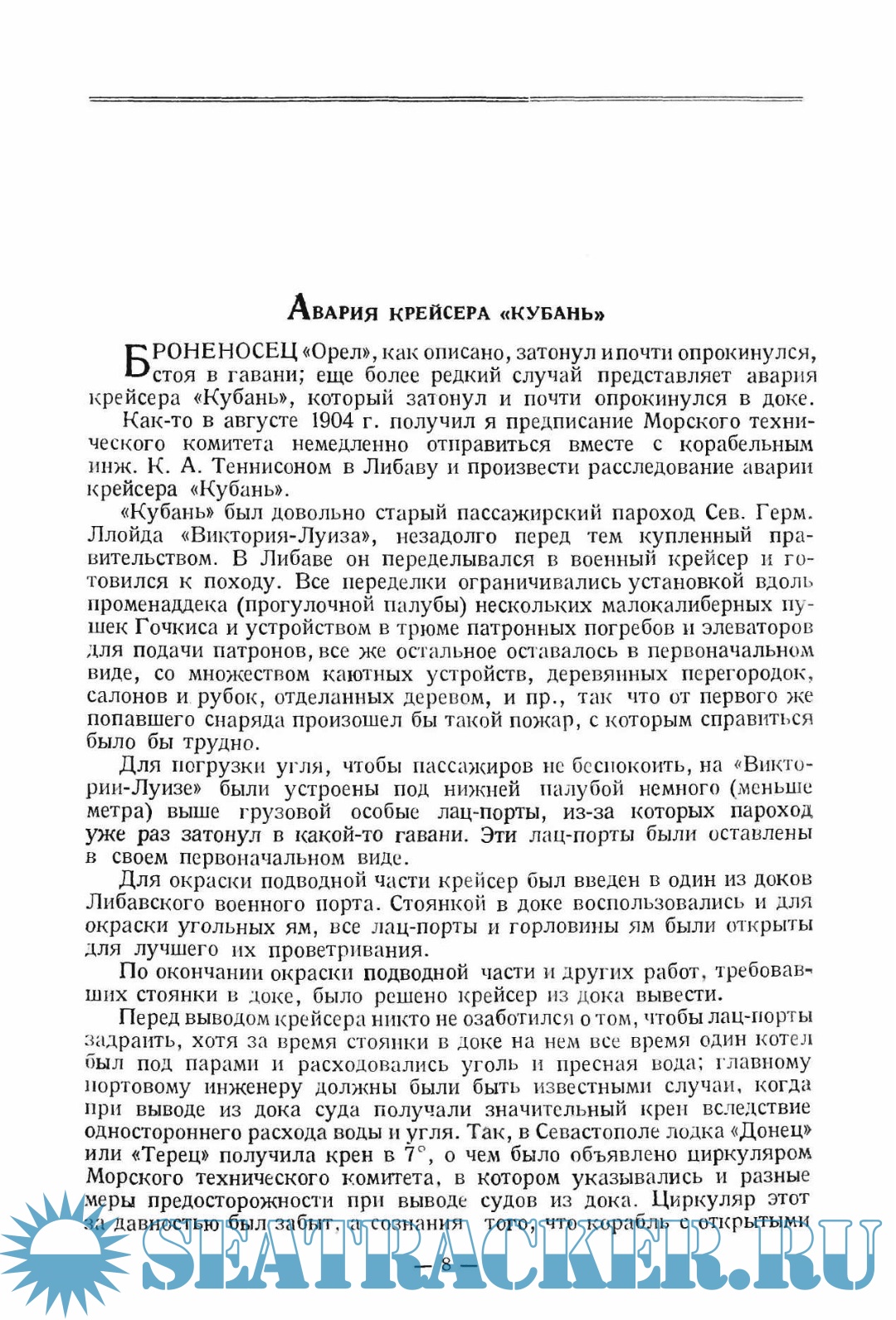 Описание: Сборник статей академика А.Н.Крылова, посвящённый разбору происшествий с военными кораблями (броненосцами "Орёл" и "Гангут", крейсером "Кубань", линкором "Императрица Мария", британским парусником "Ройял Джордж" и др.) и торговыми и пассажирскими судами ("Титаник", танкер "Северный Азербайджан" и др.) России и других стран, опубликованных в "Сборнике ЭПРОНа". Содержит интересные сведения как технического характера, так и касающиеся поведения людей при аварии.