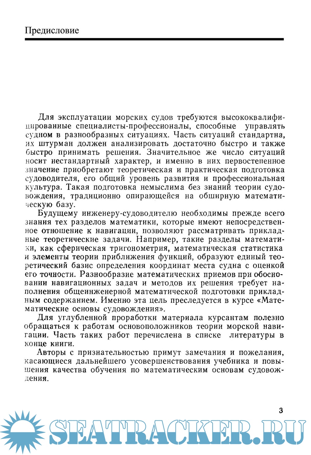 Будущему инженеру-судоводителю необходимы прежде всего знания тех разделов математики, которые имеют непосредственное отношение к навигации, позволяют рассматривать прикладные теоретические задачи. Например, такие разделы математики, как сферическая тригонометрия, математическая статистика и элементы теории приближения функций, образуют единый теоретический базис определения координат места судна с оценкой его точности. Разнообразие математических приемов при обосновании навигационных задач и методов их решения требует наполнения общеинженерной математической подготовки прикладным содержанием. Именно эта цель преследуется в курсе «Математические основы судовождения».