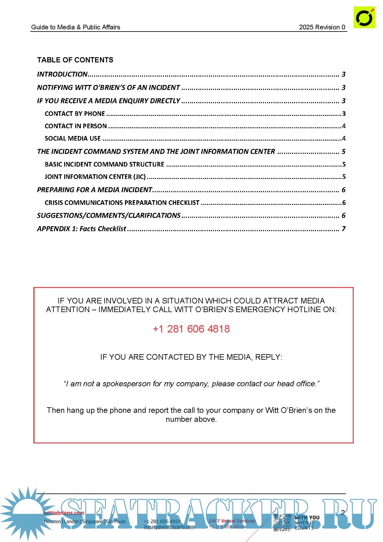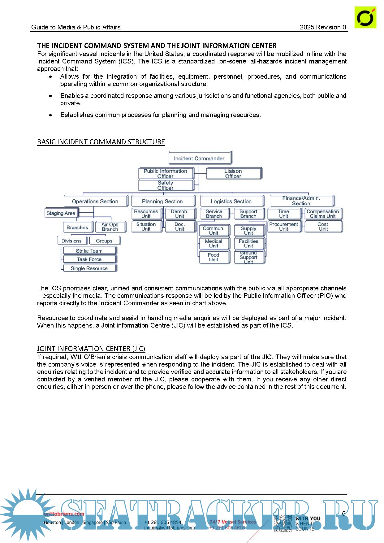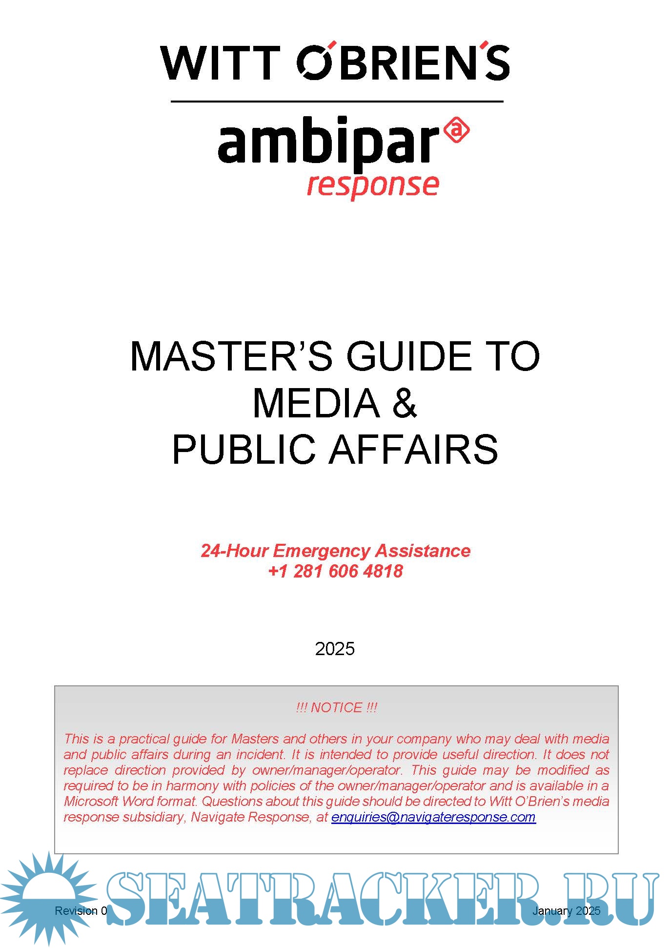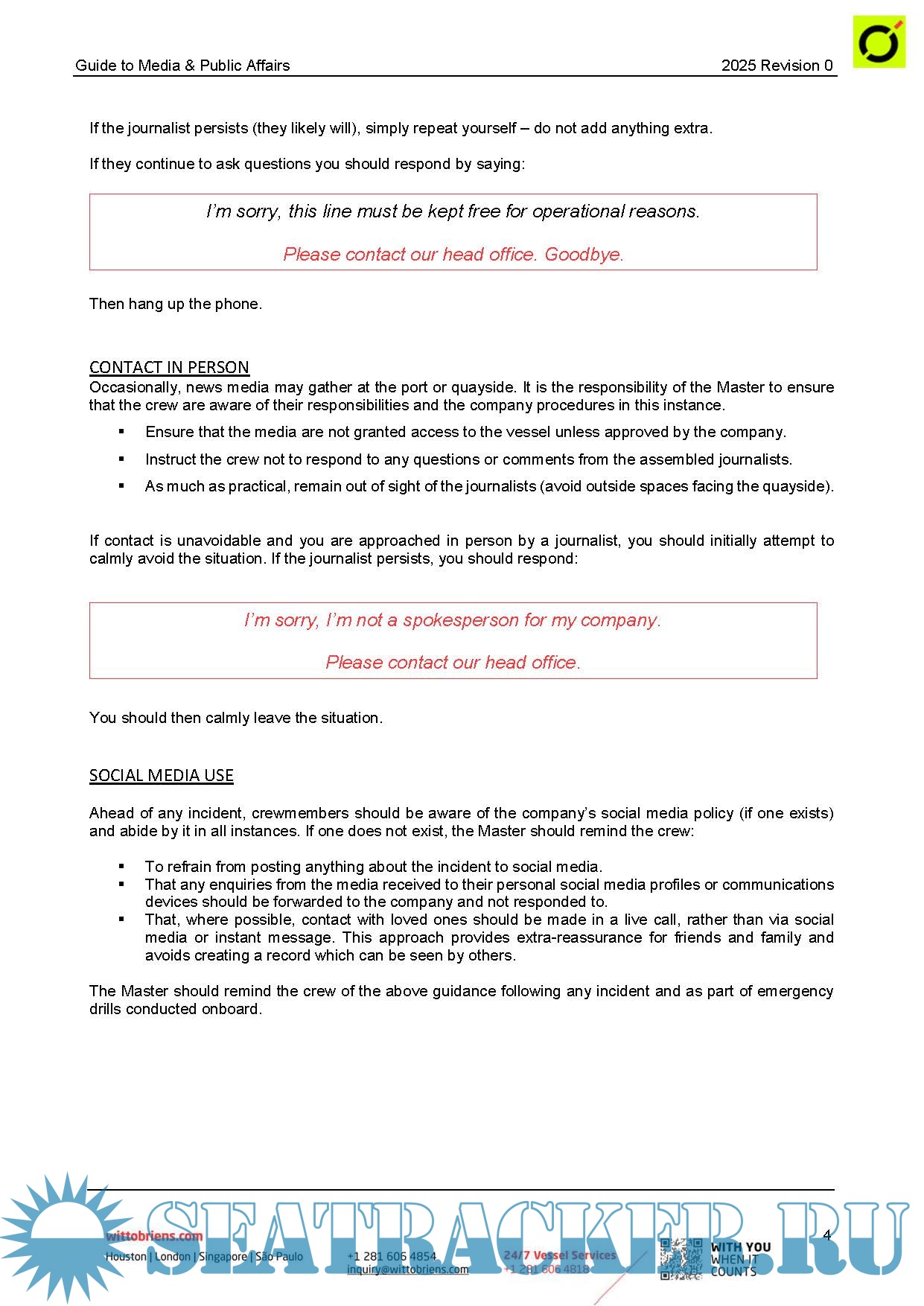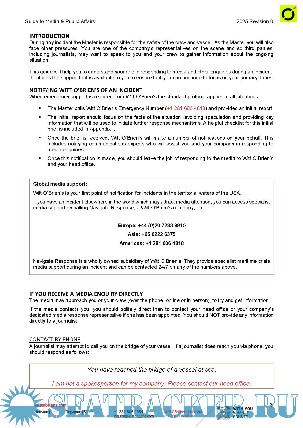This is a practical guide for Masters and others in your company who may deal with media and public affairs during an incident. It is intended to provide useful direction. It does not replace direction provided by owner/manager/operator. This guide may be modified as required to be in harmony with policies of the owner/manager/operator and is available in a Microsoft Word format. Questions about this guide should be directed to Witt O’Brien’s media response subsidiary, Navigate Response
