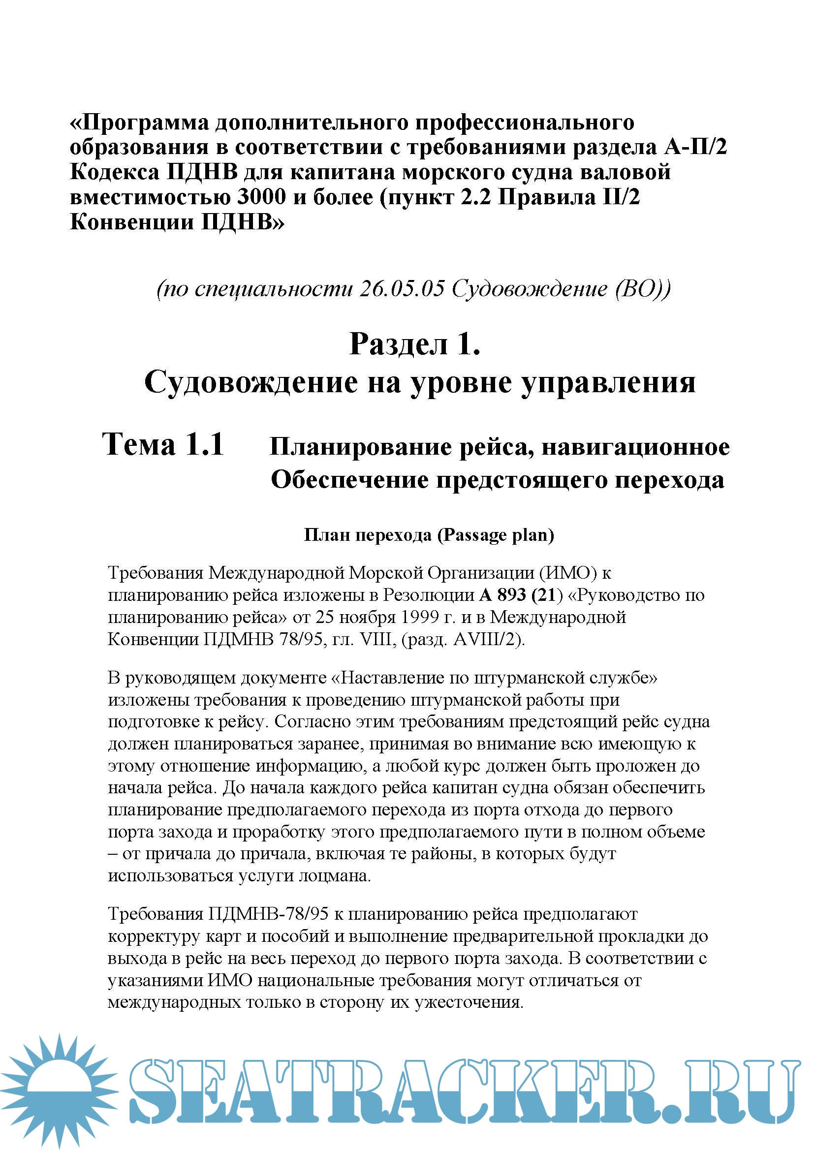 1. «Программа дополнительного профессионального образования в соответствии с требованиями раздела А-II/2 Кодекса ПДНВ для капитана морского судна валовой вместимостью 3000 и более (пункт 2.2 Правила II/2 Конвенции ПДНВ». 160 часов