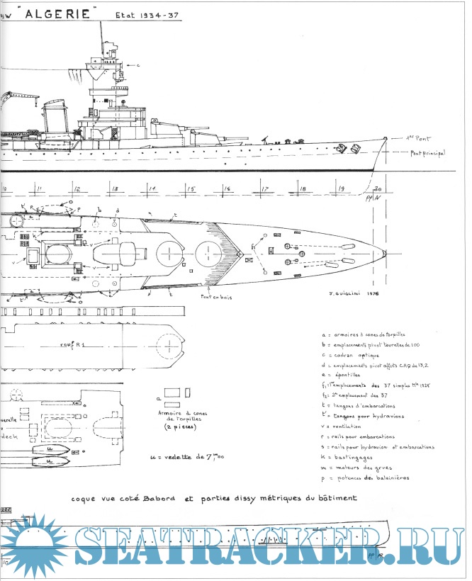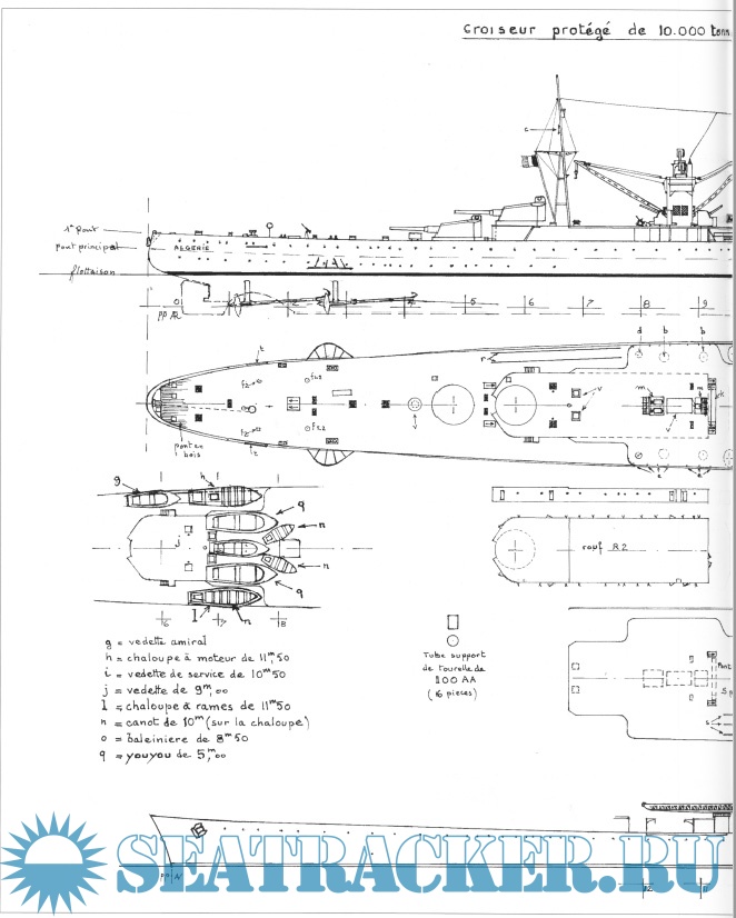 Description: L'Algérie est le dernier des sept croiseurs de 10 000 tw construit en France entre 1924 et 1934. Ce croiseur a été un bâtiment réussi sur le plan technique, bien armé et bien protégé tout en conservant une vitesse satisfaisante et une autonomie supérieure à celle des croiseurs français précédents. L'élégance du bâtiment est évidente. L'Algérie a été un beau bateau. Basé à Toulon, il sert de navire-amiral pendant toute sa courte carrière, avant de disparaître lors du dramatique sabordage de la flotte le 27 novembre 1942, après seulement huit ans d'activité.