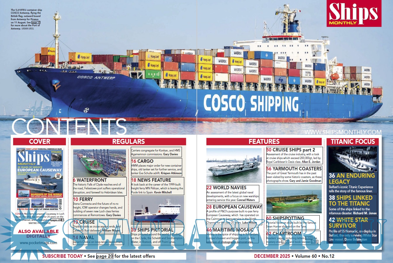Description: Ships Monthly is the world's leading international shipping magazine. Ships Monthly provides news and features for ship enthusiasts and maritime professionals, including reports on the ferry, cruise, new building and cargo ship scene as well as navies across the world.The latest issue of Ships Monthly is out now, and is packed with all the usual news and features, including outstanding articles and features.