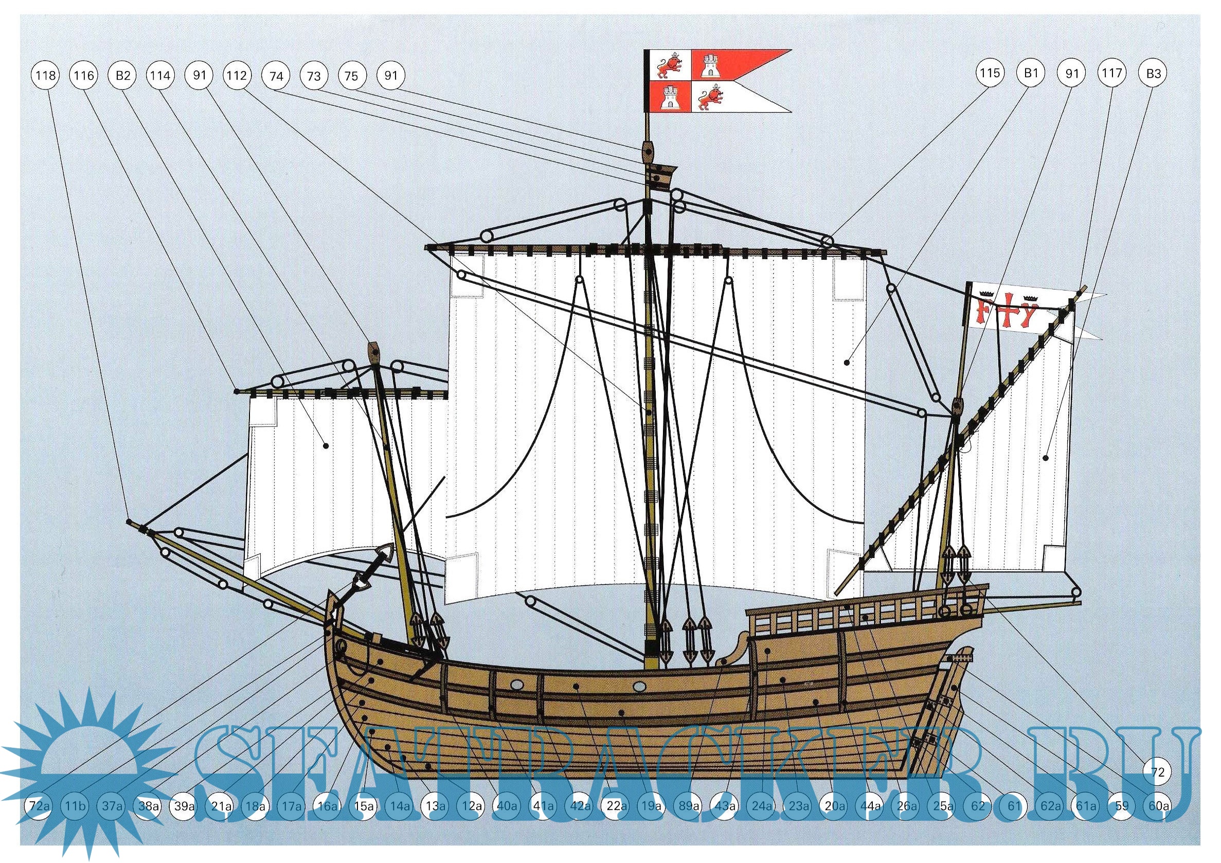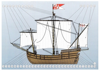 Описание: 18 листов цветных выкроек и инструкций для изготовления бумажной модели каравеллы Колумба PINTA