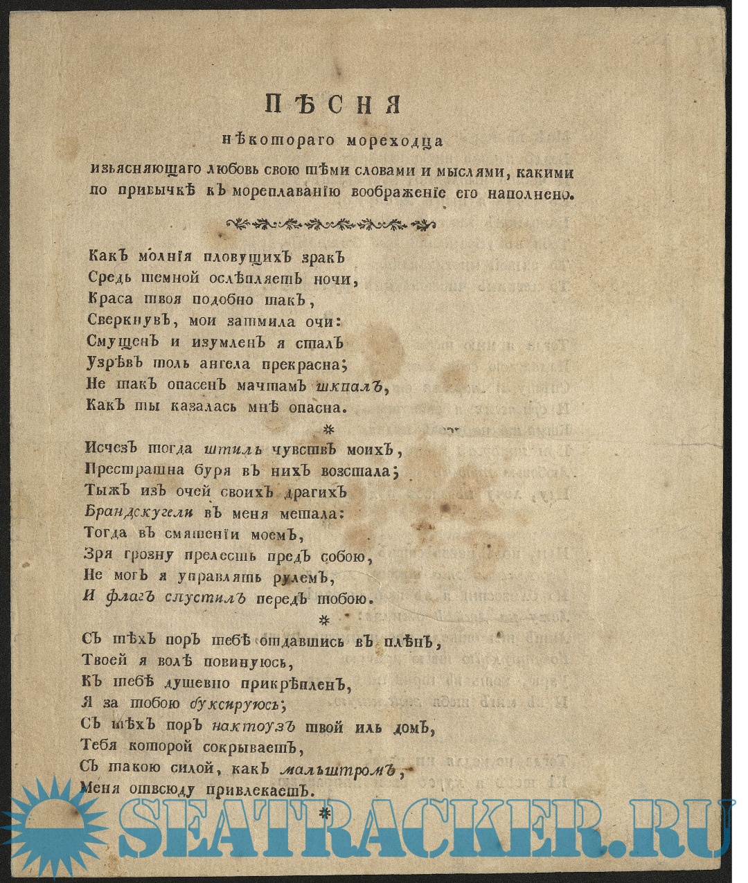 Песня некотораго мореходца изъясняющаго любовь свою теми словами и мыслями, какими по привычке к мореплаванию воображение его наполнено