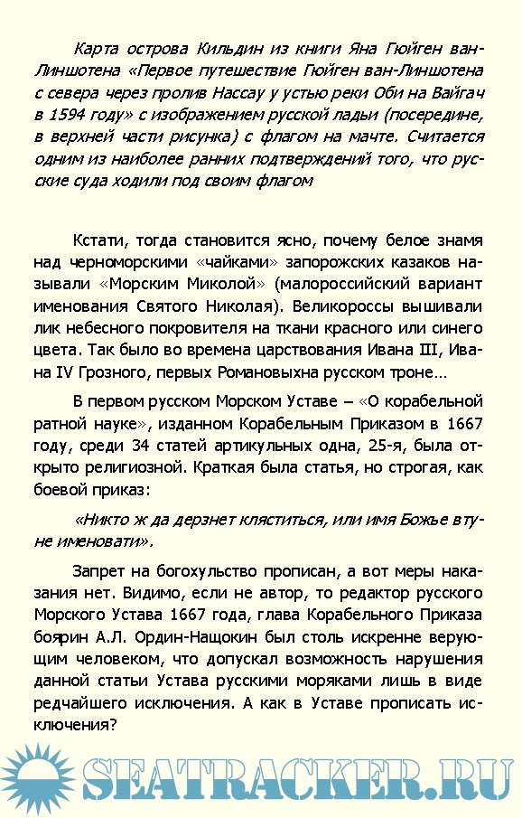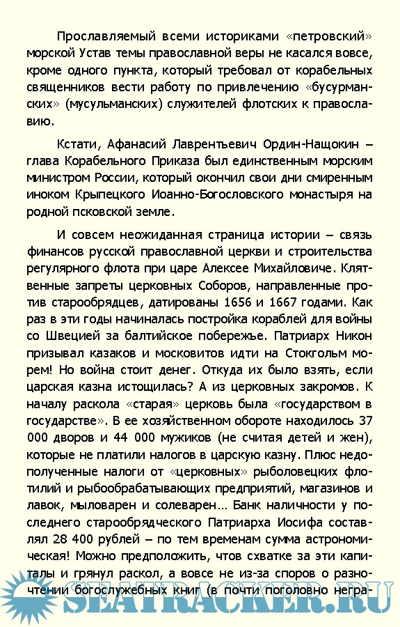 Содержание Предисловие Авторское вступление Духовные наставники морских служителей допетровской Руси Корабельная церковь при царе-антихристе «Революционные реформы» Петра I Забытые подвижники веры Жизнь и приключения монаха-гидрографа Последнее религиозное сожжение Корабельные священники «Золотого века» вольных каменщиков «Золотой век» масонства на флоте Сподвижники «Екатерининских орлов» Ряженый матрос или архиепископ реандамский? Безвестный благочинный эскадры Ушакова Мореплаватели в рясах Молебен у берегов Антарктиды Иеромонах с «Невы» Обвенчанные под андреевским флагом Архимандрит Аввакум - монах-синолог На сенатской замечены не были В последних сражениях парусного флота Отличившиеся при Наварине Священники синопского сражения Духовник Цесаревича и другие «Похвальный религиозный поступок» Корабельные священники броненосного флота У стен Порт-Артура, в купели Цусимы Крест против бунта Священники Великой Отечественной... 1914-1917 гг... Первый и последний В боях и походах Счастливый рок иеромонаха Федора Круглова Подвиг отца Антония Спасенные молитвой «Герои» смутного времени Заключение Приложение 1. О пастырском служении в русском военном флоте Приложение 2. Гибель «Рюрика» Приложение 3. Воспоминания о «Палладе» Использованные источники