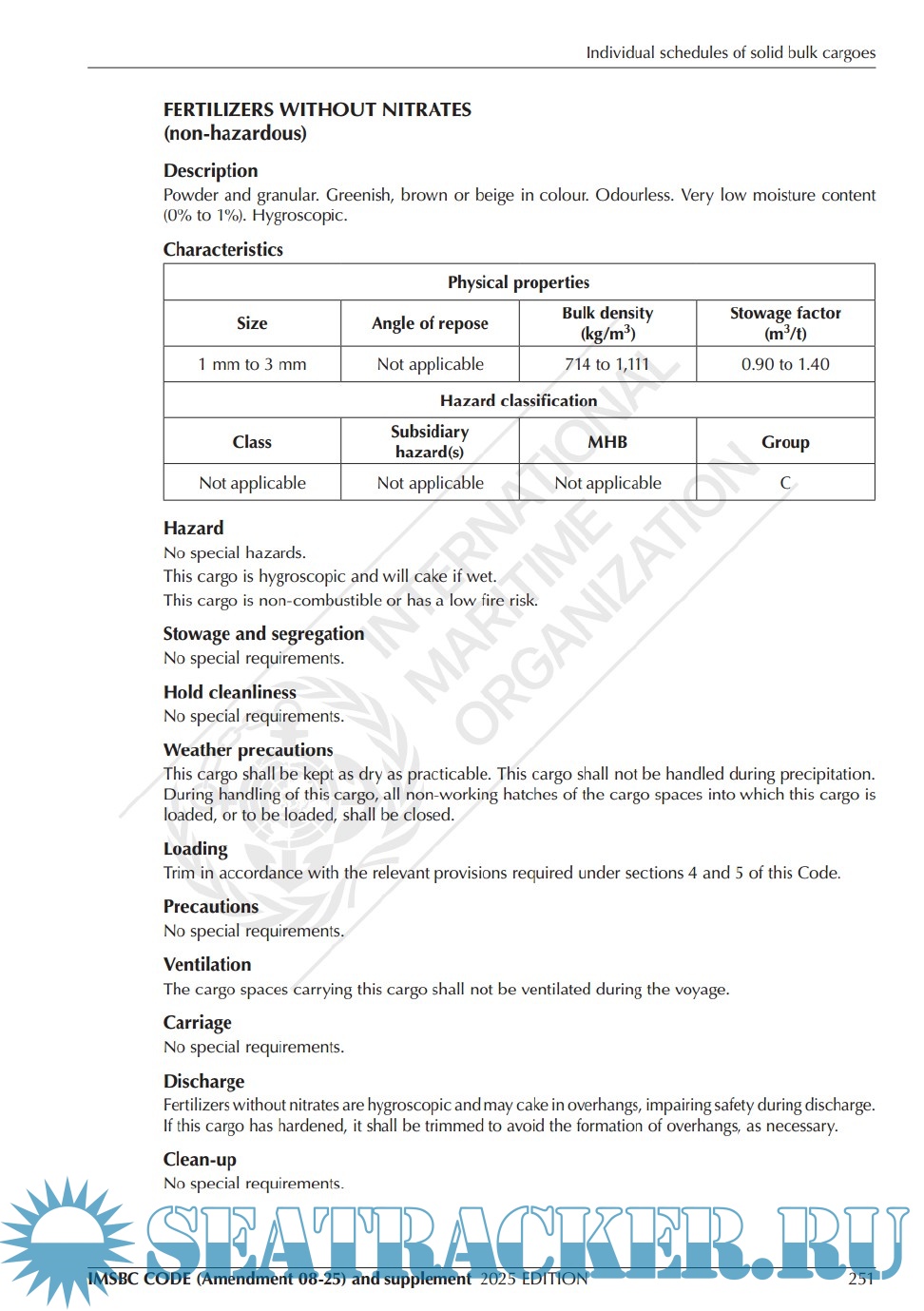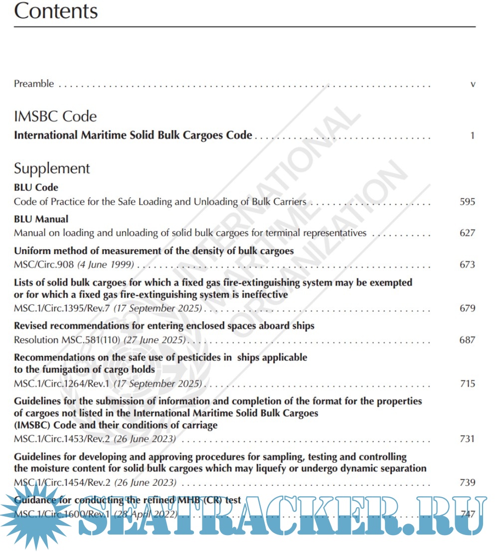 Description: The International Maritime Solid Bulk Cargoes Code (IMSBC Code), adopted on 4 December 2008 by resolution MSC.268(85), entered into force on 1 January 2011, from which date it was made mandatory under the provisions of the SOLAS Convention. The present edition incorporates Amendment 08-25, which may be applied from 1 January 2026 on a voluntary basis, anticipating its envisaged official entry into force on 1 January 2027.
