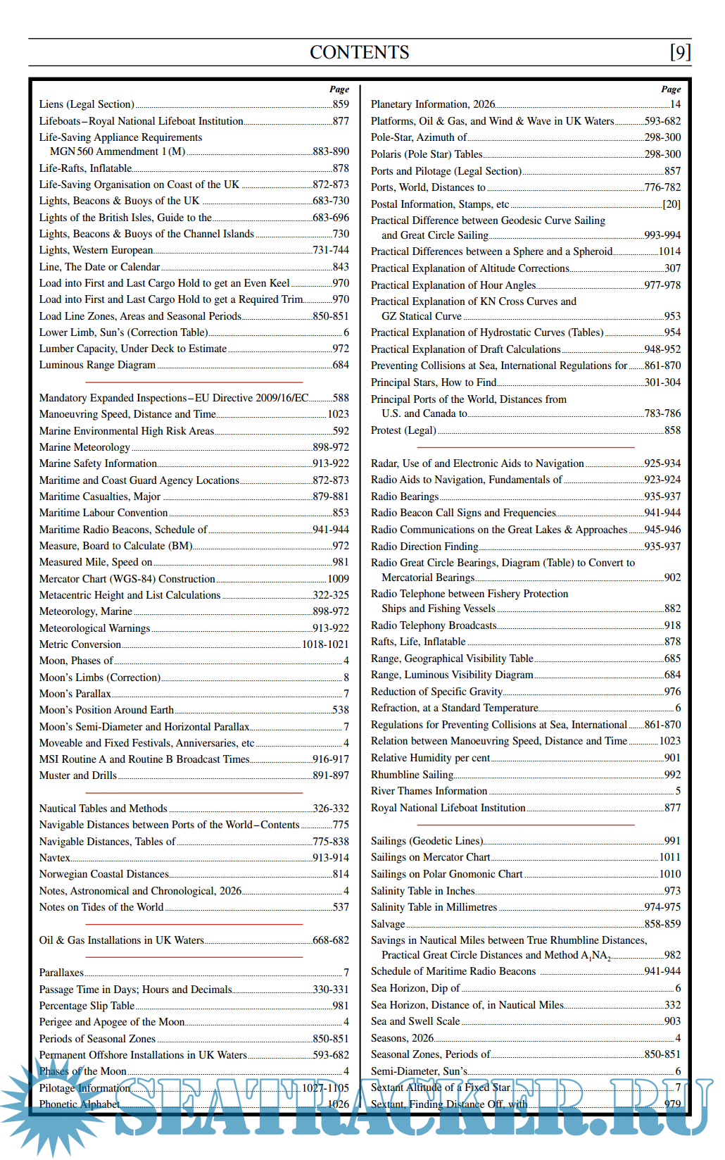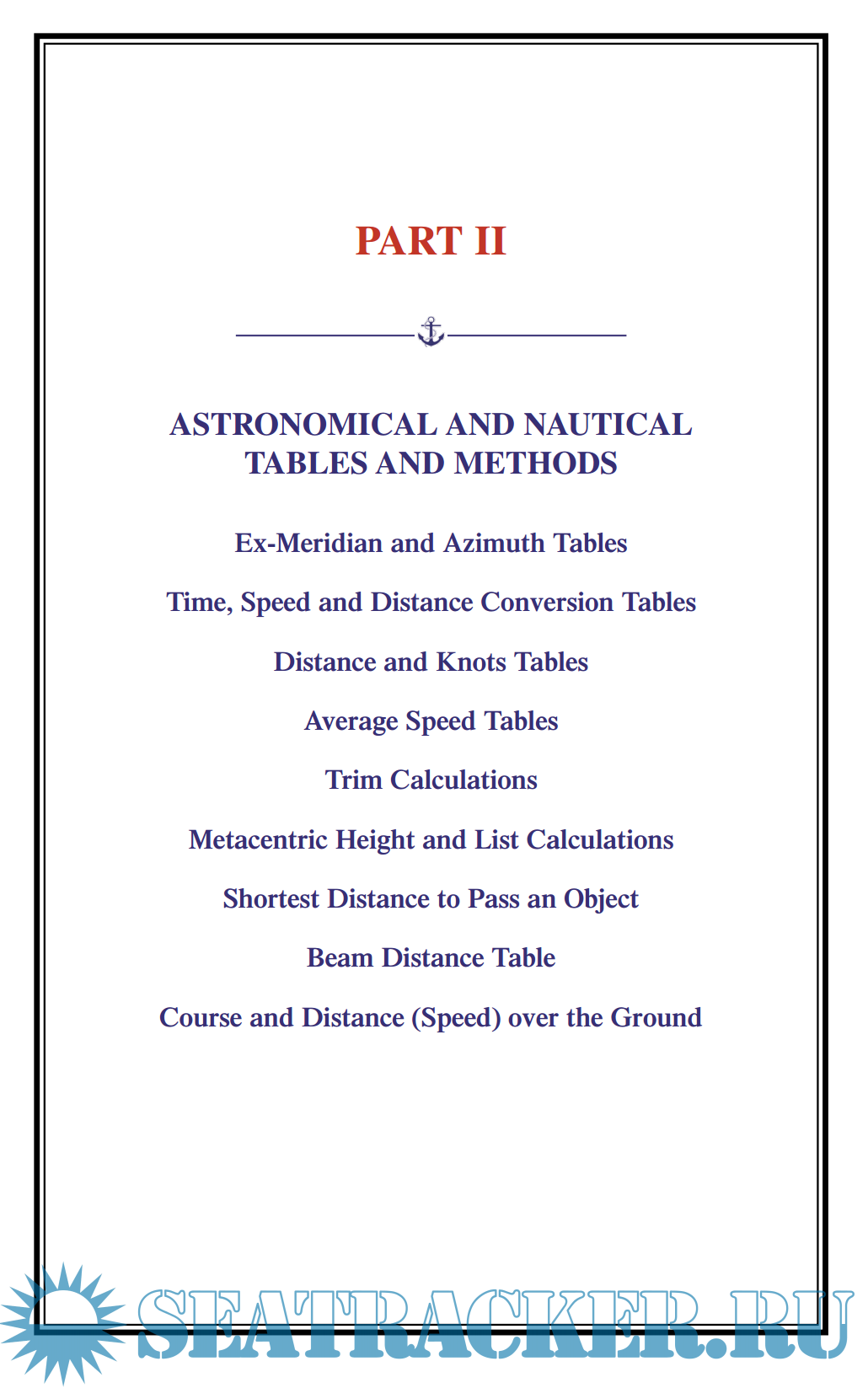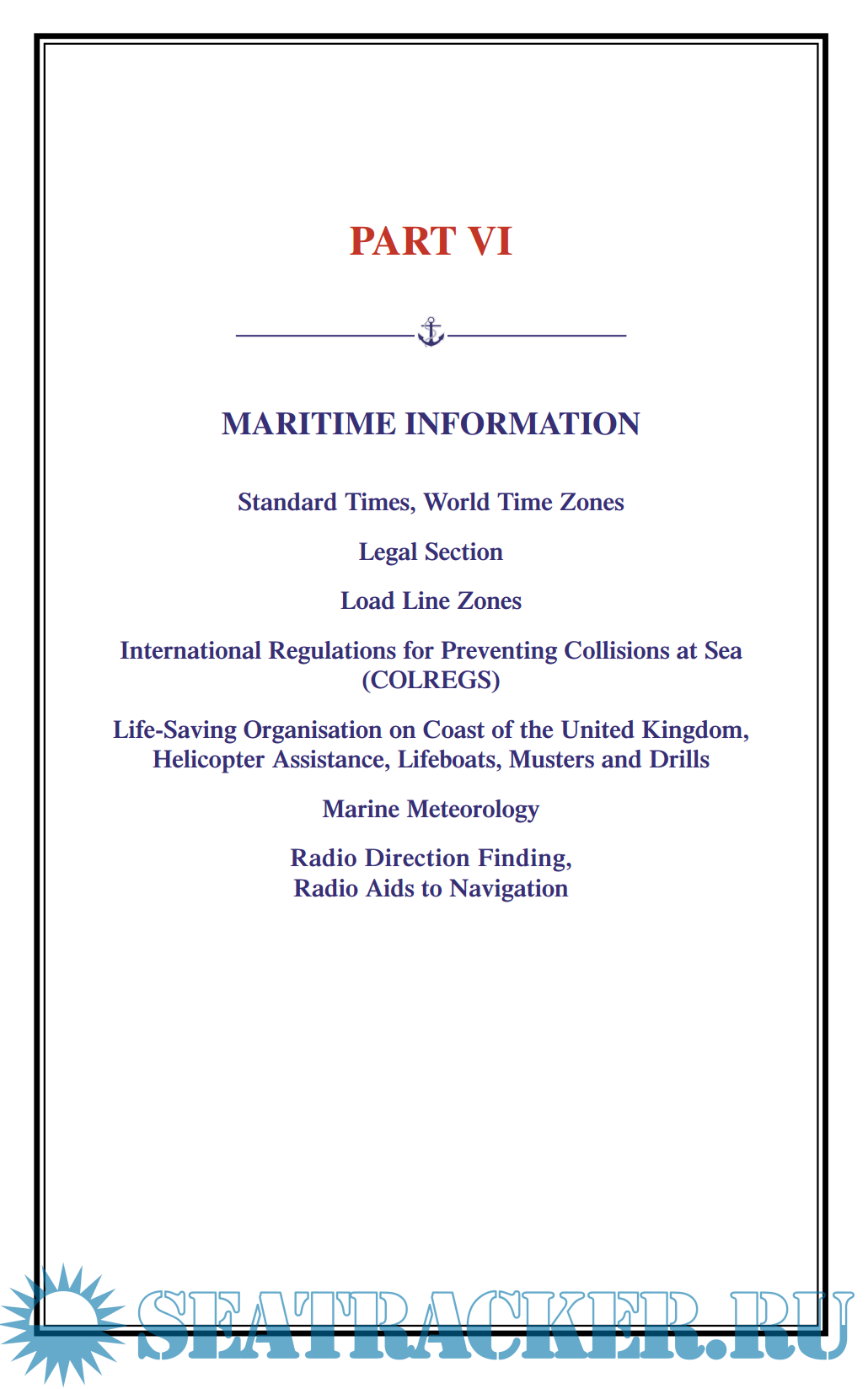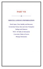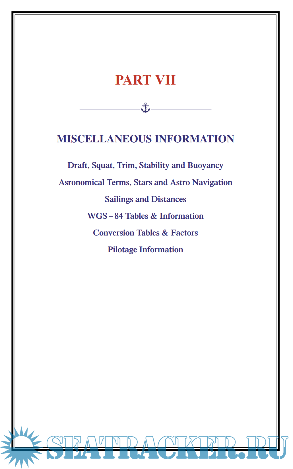 • VII Miscellaneous Information covering Stability, Buoyancy, Celestial, Sailings and Navigation. The Pilotage Information section has been revised to conform with notices issued by Admiralty, Hydrographic Authorities and Port Authorities.