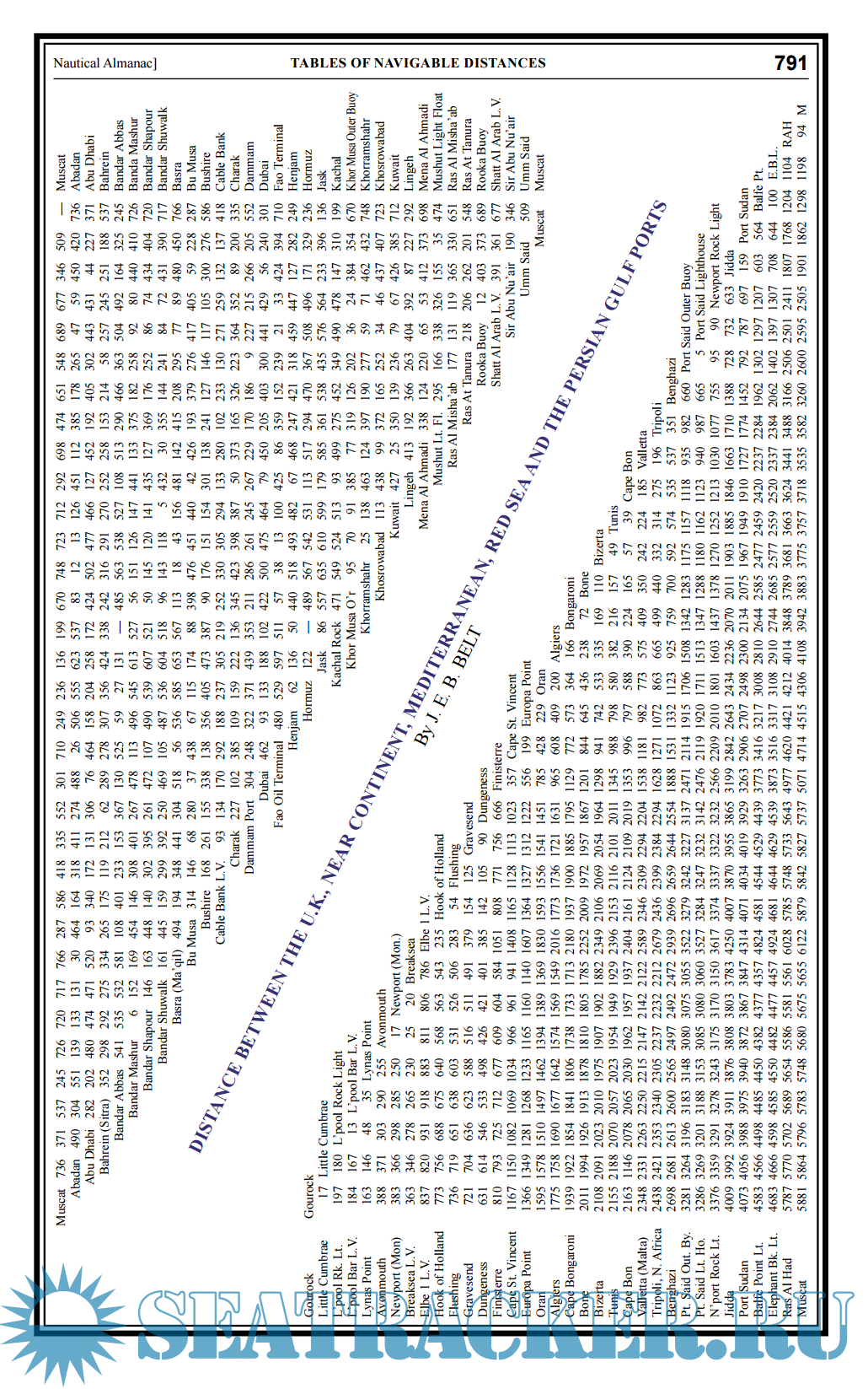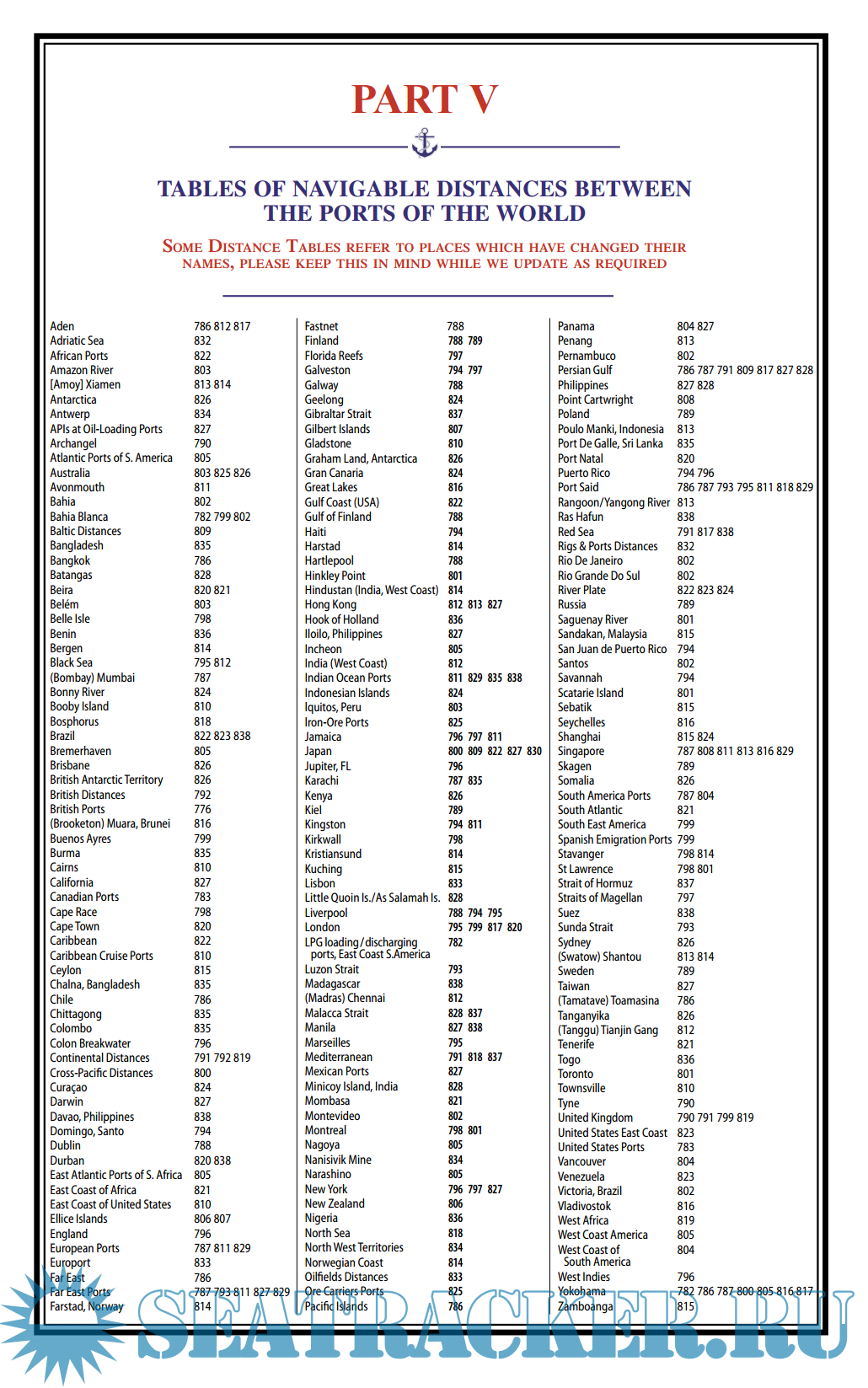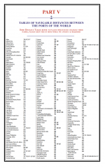 • V Navigable Distance Tables giving a world-wide coverage of total distances from the principal ports of Britain, U.S.A. and Canada, to all important ports of the world.